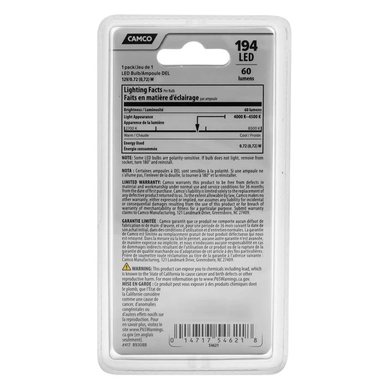 Wedge D.F. Base Bright White LED Bulb by Camco®. When it’s dark outside, you want to spend a cozy evening inside your RV. And it’s almost impossible without functional indoor lighting. This superior product is meant to provide excellent lighting performance and ensure long, dependable service. It was produced using advanced materials for high effectiveness and uncompromising value. Invest in quality products we provide and benefit from reliable lighting solutions.