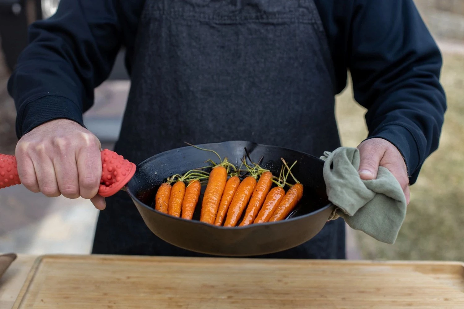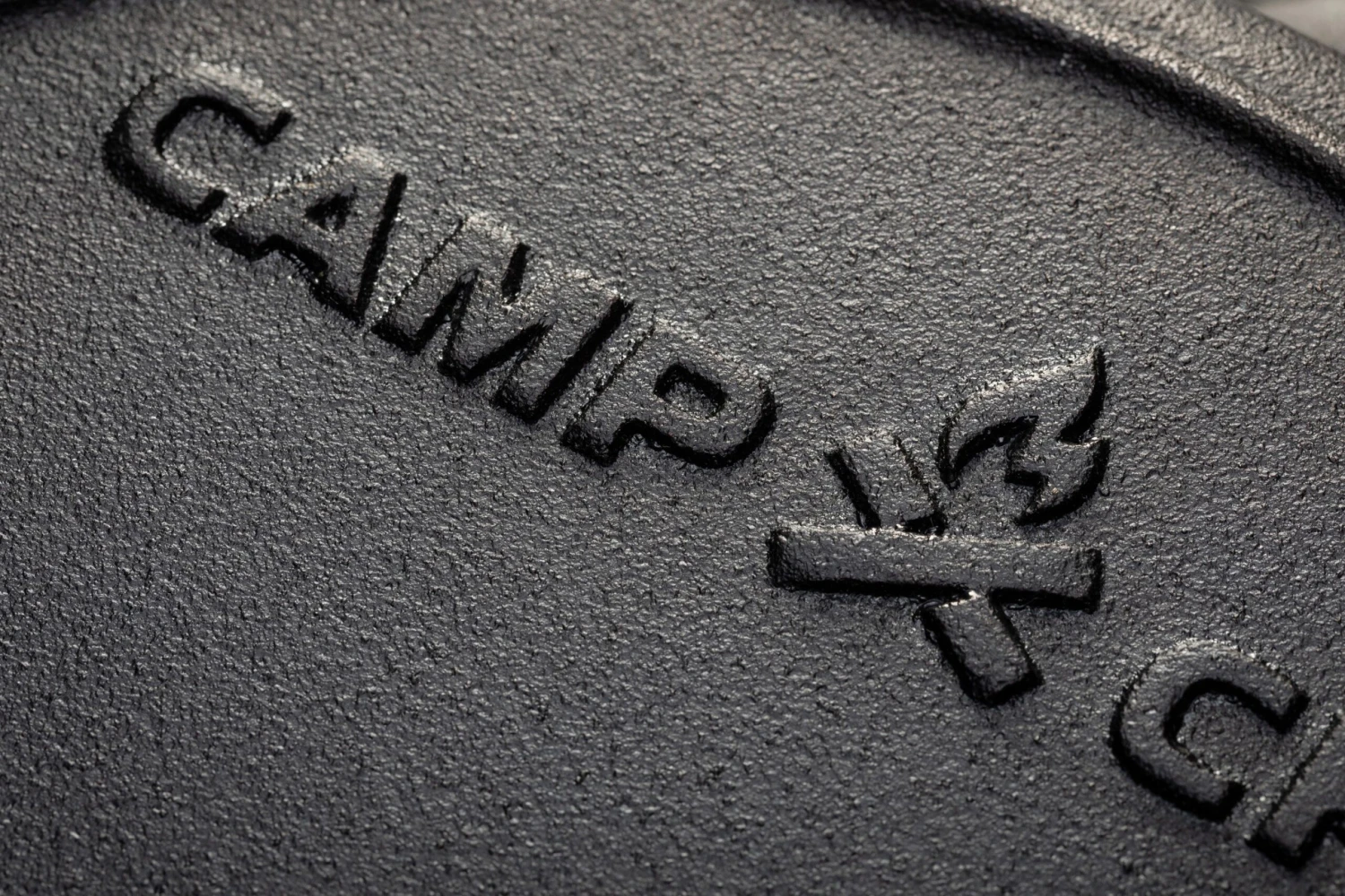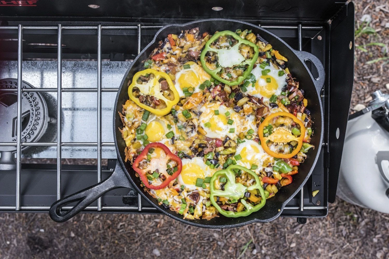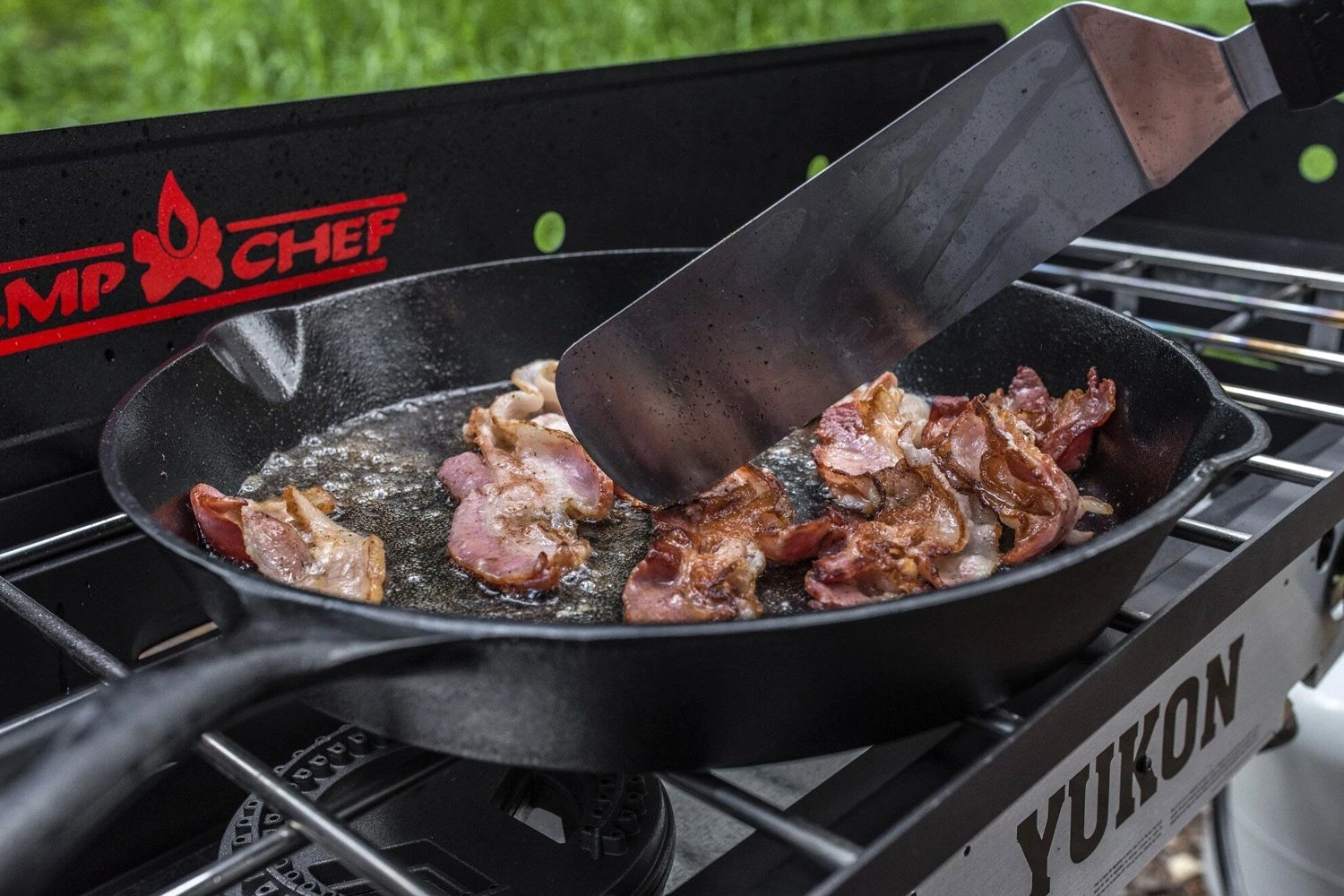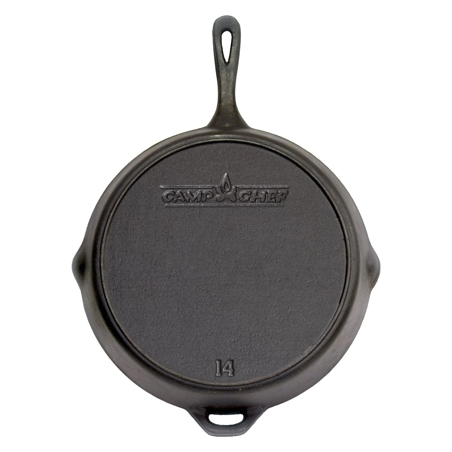 14″ Cast Iron Skillet by Camp Chef®. 1 Piece. Create the most delicious meals from scrambled eggs to monkey bread with this can’t-go-wrong 12-inch seasoned cast iron skillet. The handle is designed for comfort as you cook, carry and pour with the pan, while dual pour spouts add to the convenience. Best of all, you can skip the hours of prep time with your brand new cast iron thanks to its seasoned, chemical-free finish. Get cooking right away!