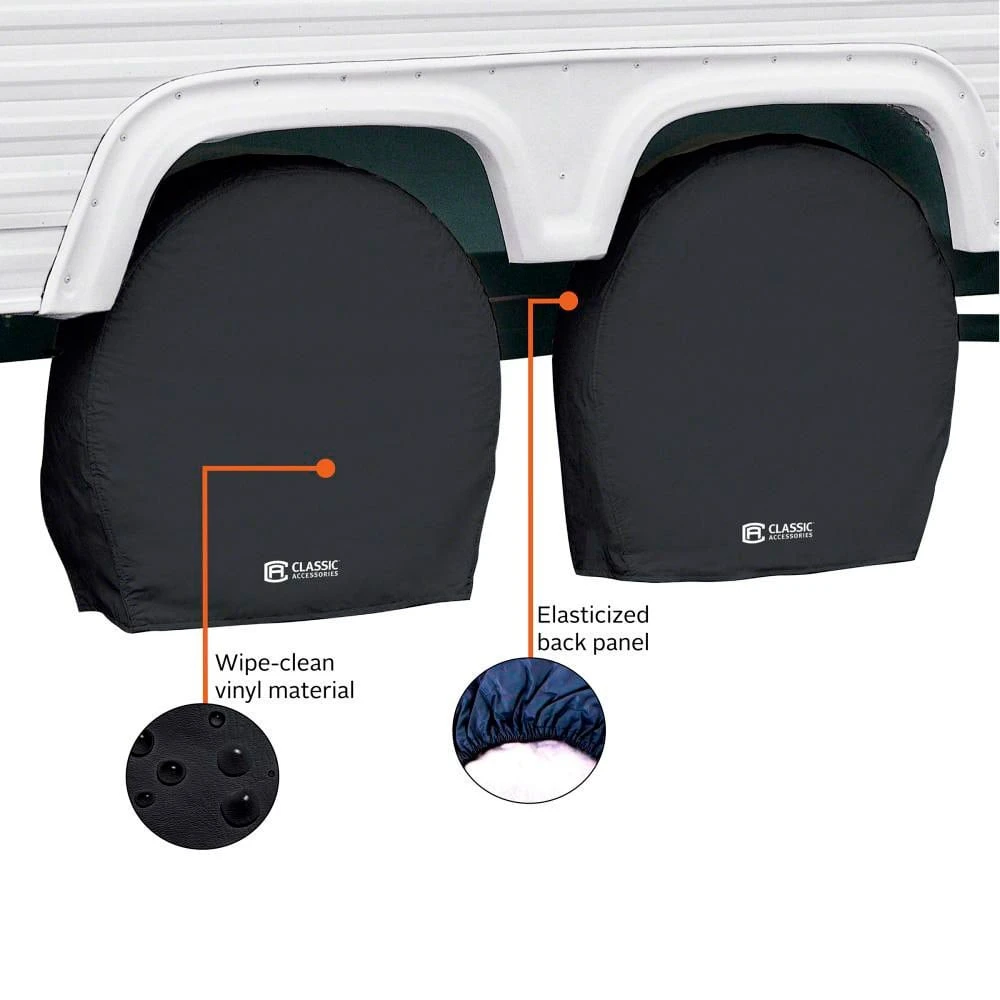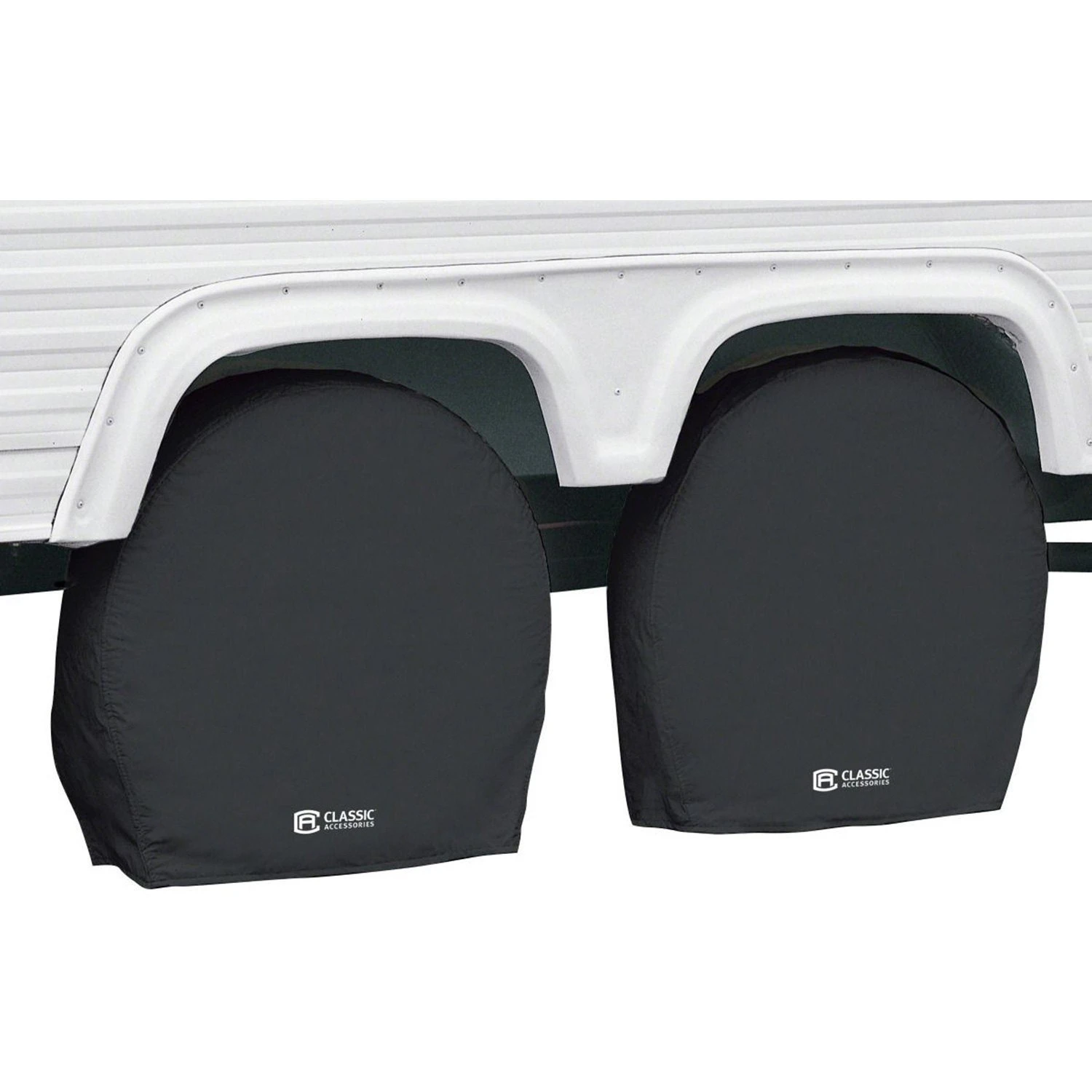 Over Drive™ Black Single Axle RV Wheel Covers (Black, 18″-21″Dia) (80-235-300402-00) by Classic Accessories®. The Over Drive RV Wheel Covers by Classic Accessories provides sturdy tire protection, guarding tires and wheels against sun damage, dirt and rust when your RV is parked. When you buy a Classic Accessories RV cover you are not just getting a cover – you’re also purchasing peace of mind.