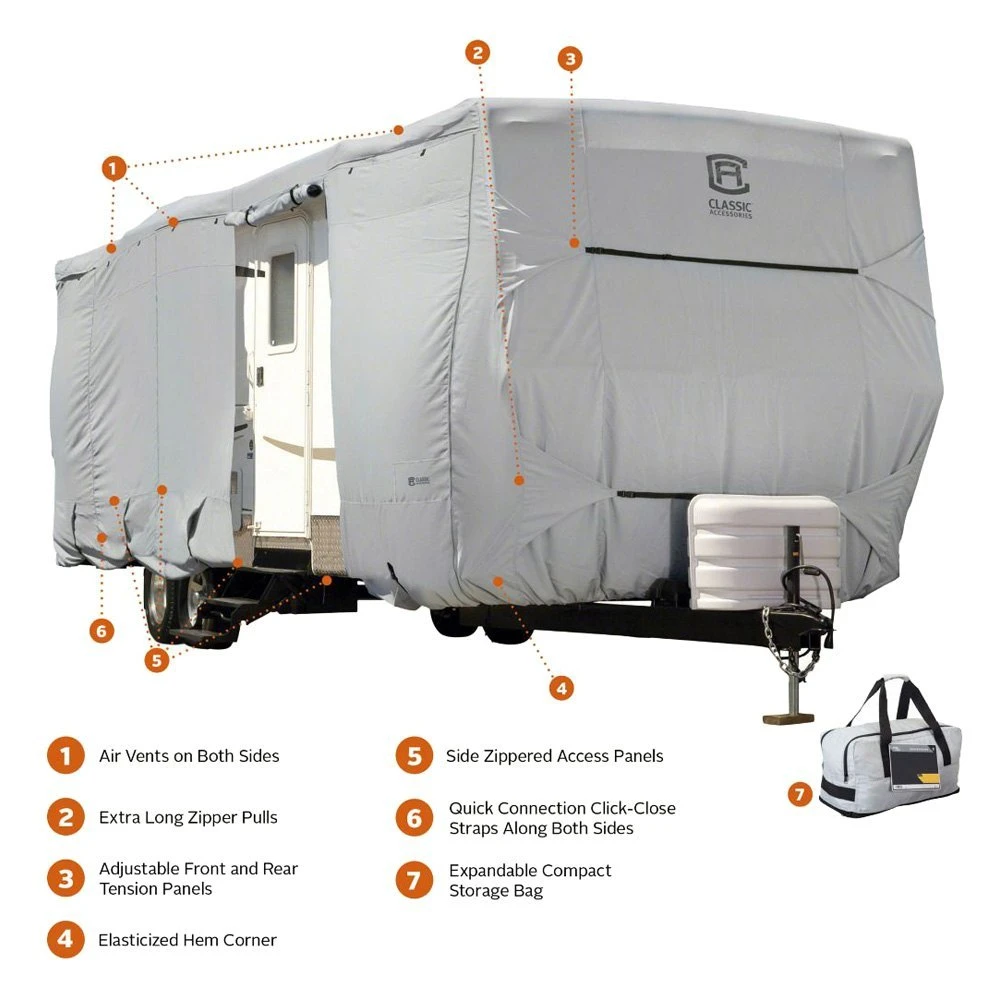 Over Drive PermaPRO™ Gray Travel Trailer Cover (Gray, Up to 38′) (80-326-211001-RT) by Classic Accessories®. PermaPRO RV covers provide maximum protection to keep your RV in top shape all year long. Air vents, tension panels, and extra-long zipper pulls make this cover stand out from all the rest. When you are ready to hit the road, this manageable cover fits effortlessly into its storage bag.