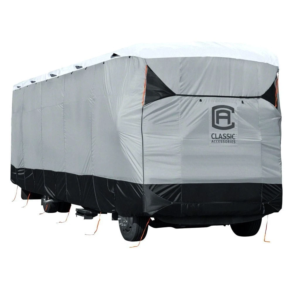 SkyShield™ Gray with White Roof Class A Motorhome Cover (Gray with White Roof, Up to 28′) (80-369-101601-EX) by Classic Accessories®. Bonded tear-resistant DuPont Tyvek top with PermaPRO ripstop sides for all-season protection. Zippered side and rear panels for easy access to storage compartments.