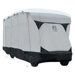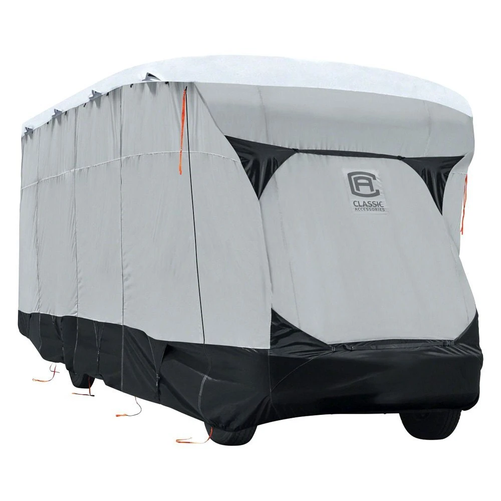 SkyShield™ Gray with White Roof Class C Motorhome Cover (Gray with White Roof, Up to 20′) (80-375-101401-EX) by Classic Accessories®. Bonded tear-resistant DuPont Tyvek top with PermaPRO ripstop sides for all-season protection. Zippered side and rear panels for easy access to storage compartments.