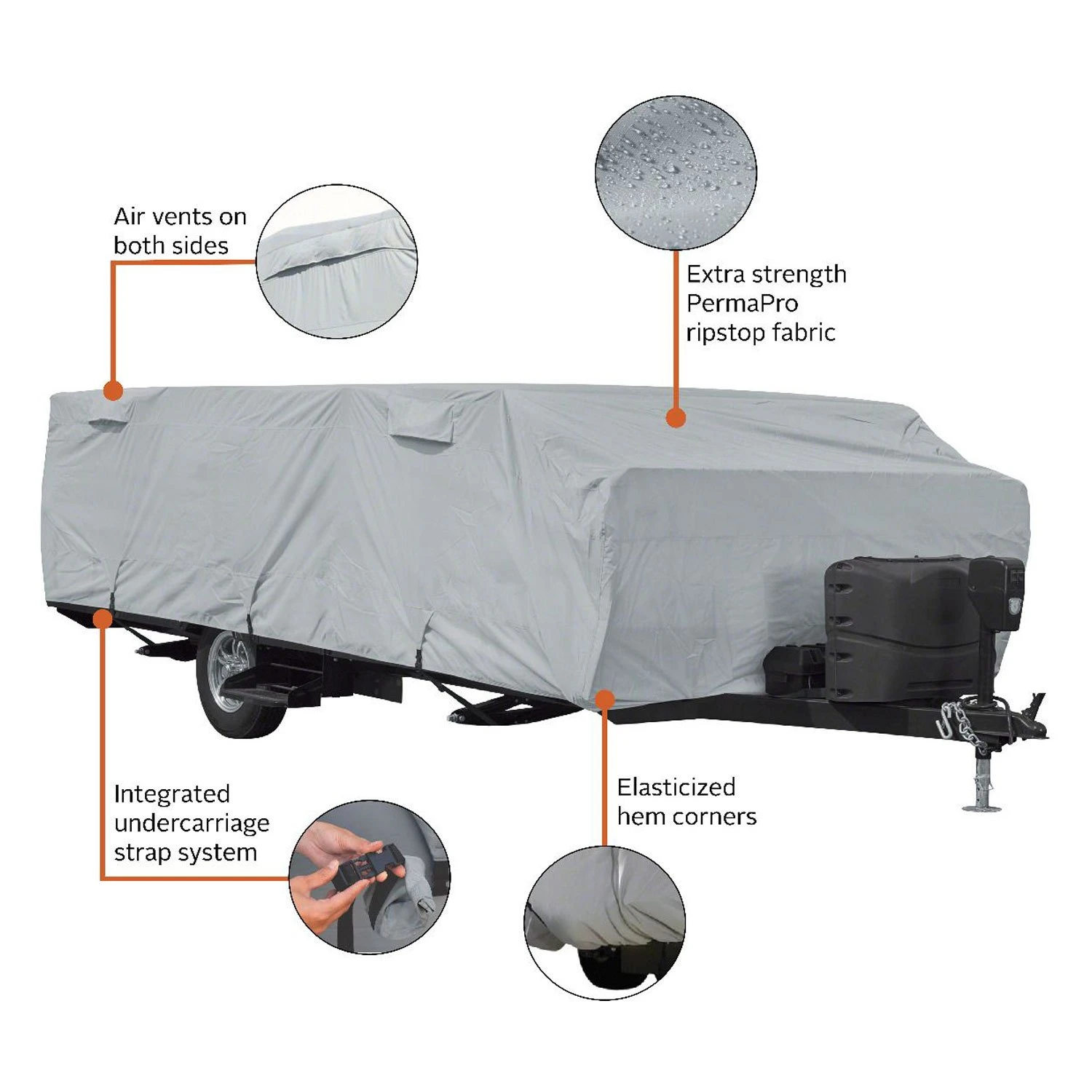 PermaPro™ Gray Pop-Up Trailer Cover (Gray, Up to 20′) (80-406-191001-RT) by Classic Accessories®. PermaPRO RV covers provide maximum protection to keep your RV in top shape all year long. Air vents, elastic corners, and tension panels make this cover stand out from all the rest. When you are ready to hit the road, this manageable cover fits into a zippered storage bag.