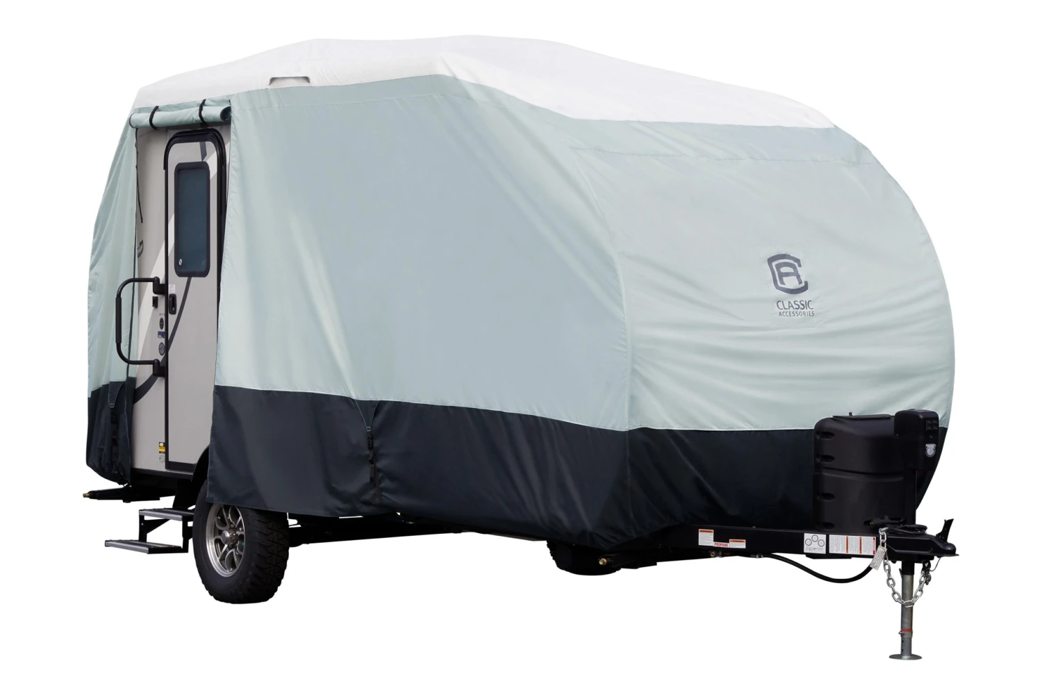 SkyShield™ Gray with White Roof R-Pod Travel Trailer Cover with Back Door (Gray with White Roof, Up to 17’7″) (80-475-173101-EX) by Classic Accessories®. Water-repellent SkyShield RV covers resist tears and scratches for durable, all-season protection. With the strong DuPont Tyvek fabric, your RV will be ready for your next adventure.