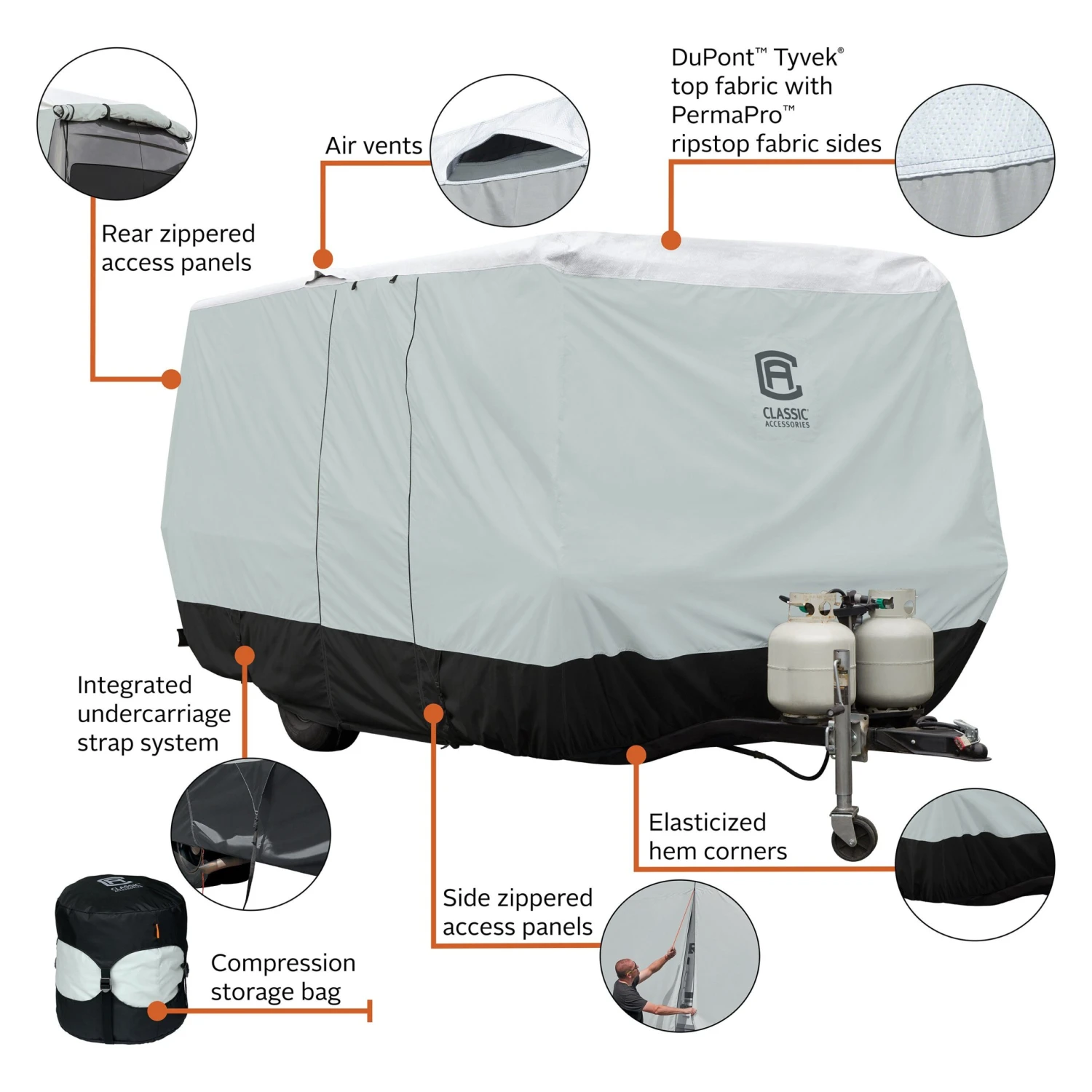 SkyShield™ Gray with White Roof Travel Trailer Cover (Gray with White Roof, Up to 10′) (80-476-143101-EX) by Classic Accessories®. Water-repellent SkyShield RV covers resist tears and scratches for durable, all-season protection. With the strong DuPont Tyvek fabric, your RV will be ready for your next adventure.