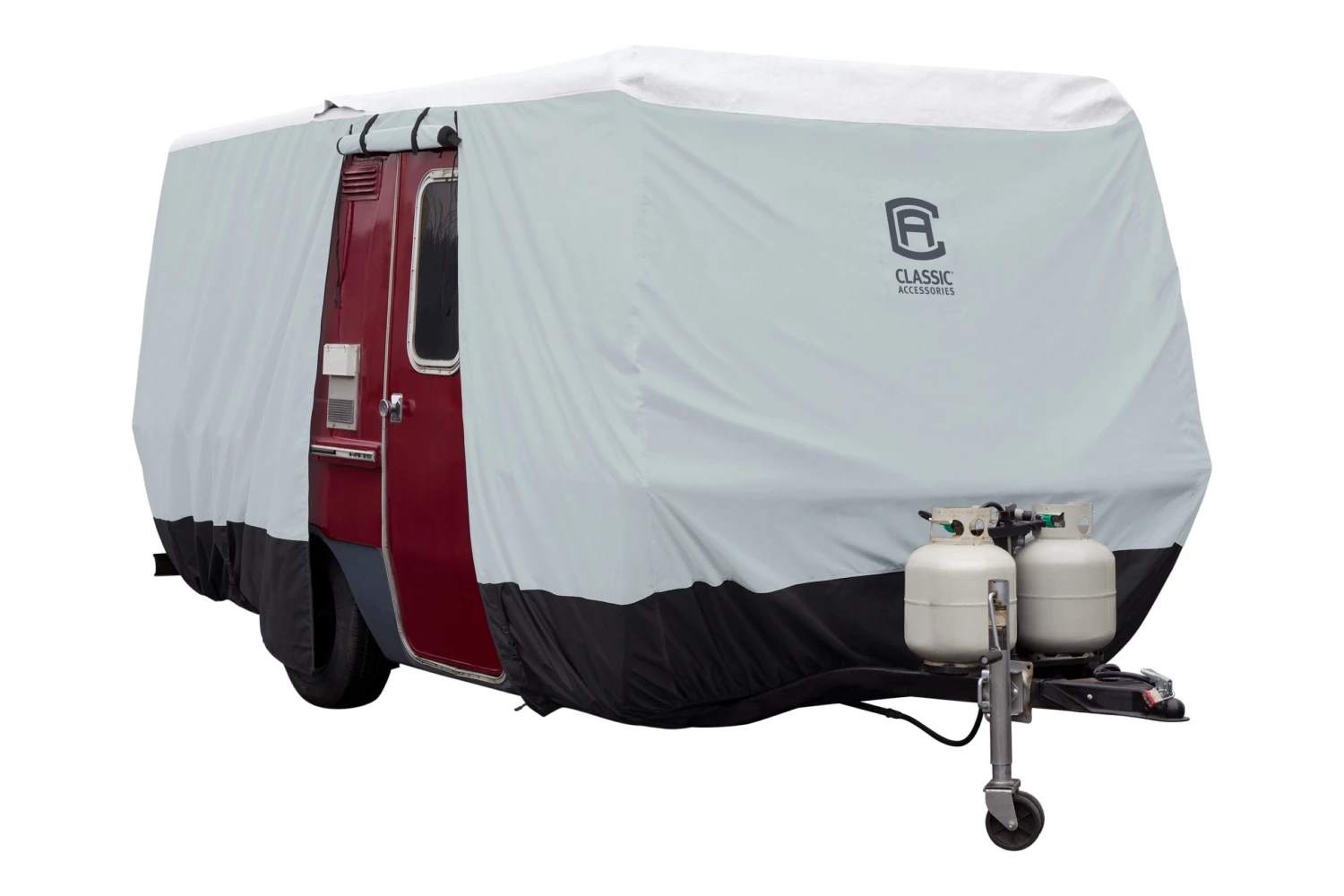 SkyShield™ Gray with White Roof Travel Trailer Cover (Gray with White Roof, Up to 16′) (80-478-163101-EX) by Classic Accessories®. Water-repellent SkyShield RV covers resist tears and scratches for durable, all-season protection. With the strong DuPont Tyvek fabric, your RV will be ready for your next adventure.