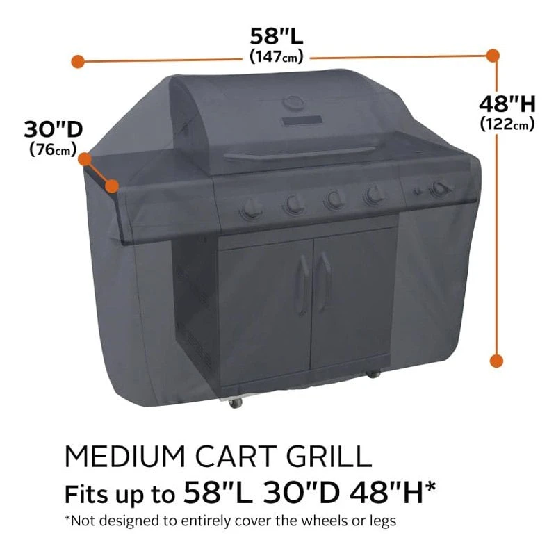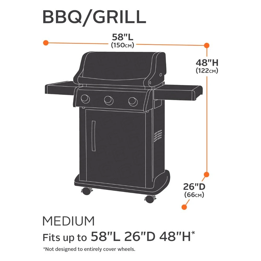 Classic™ Black Medium BBQ Grill Cover (58″L x 26″W x 48″H) by Classic Accessories®. Tough fabric with water-resistant backing protects against rain, snow, sun, dirt and won’t crack in the cold.