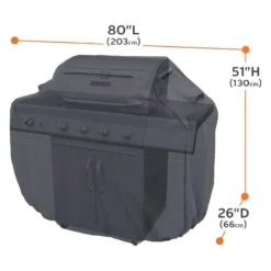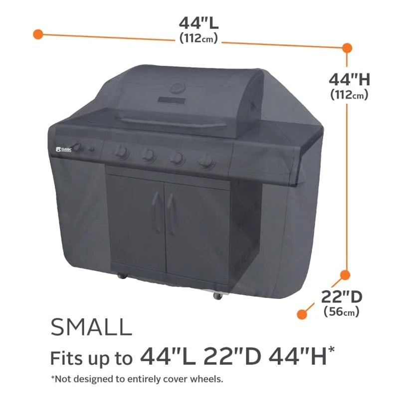 Classic™ Black Small BBQ Grill Cover (44″L x 22″W x 44″H) by Classic Accessories®. Tough fabric with water-resistant backing protects against rain, snow, sun, dirt and won’t crack in the cold.