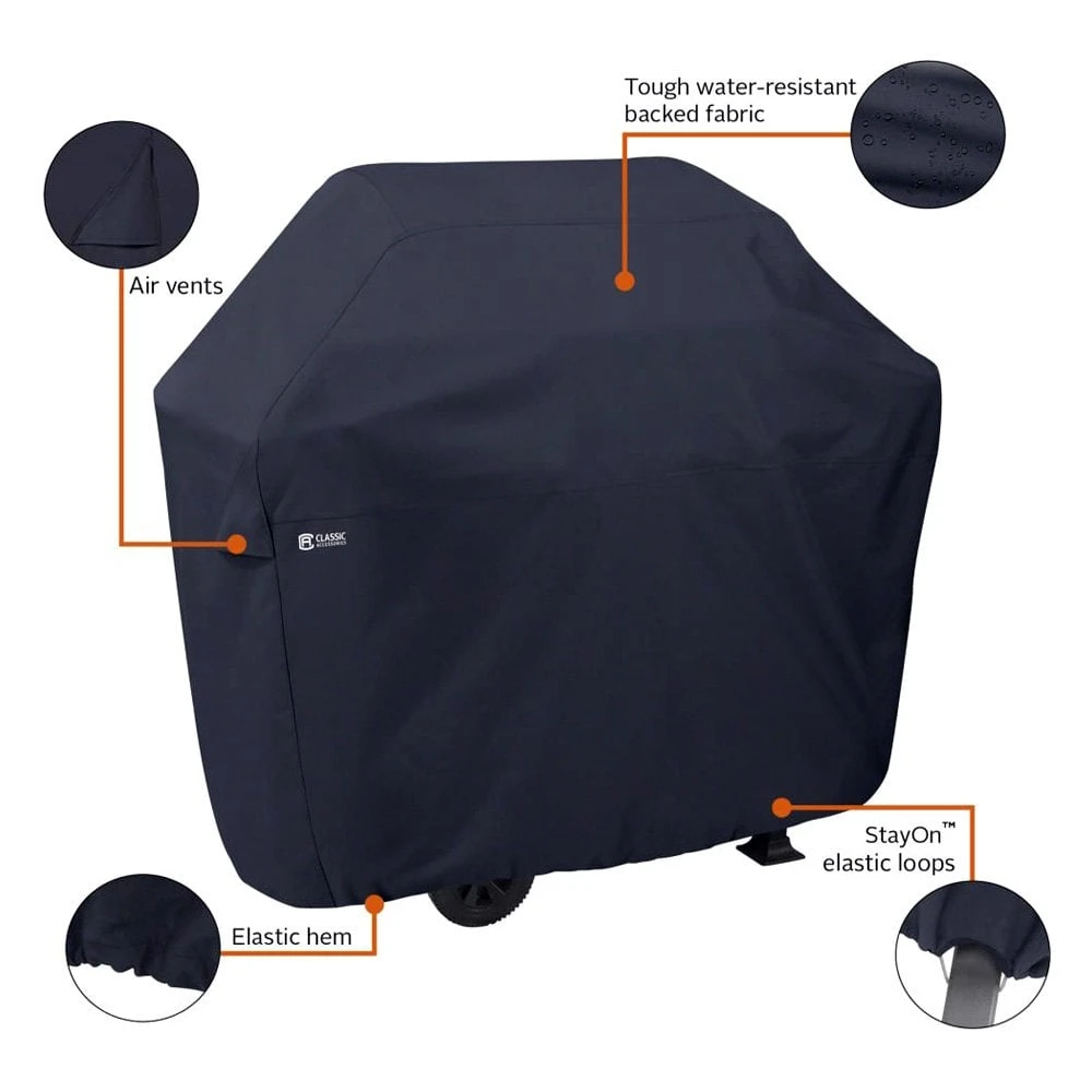 Classic™ Black Small/Medium BBQ Grill Cover (52″L x 24″W x 44″H) by Classic Accessories®. Tough fabric with water-resistant backing protects against rain, snow, sun, dirt and won’t crack in the cold.