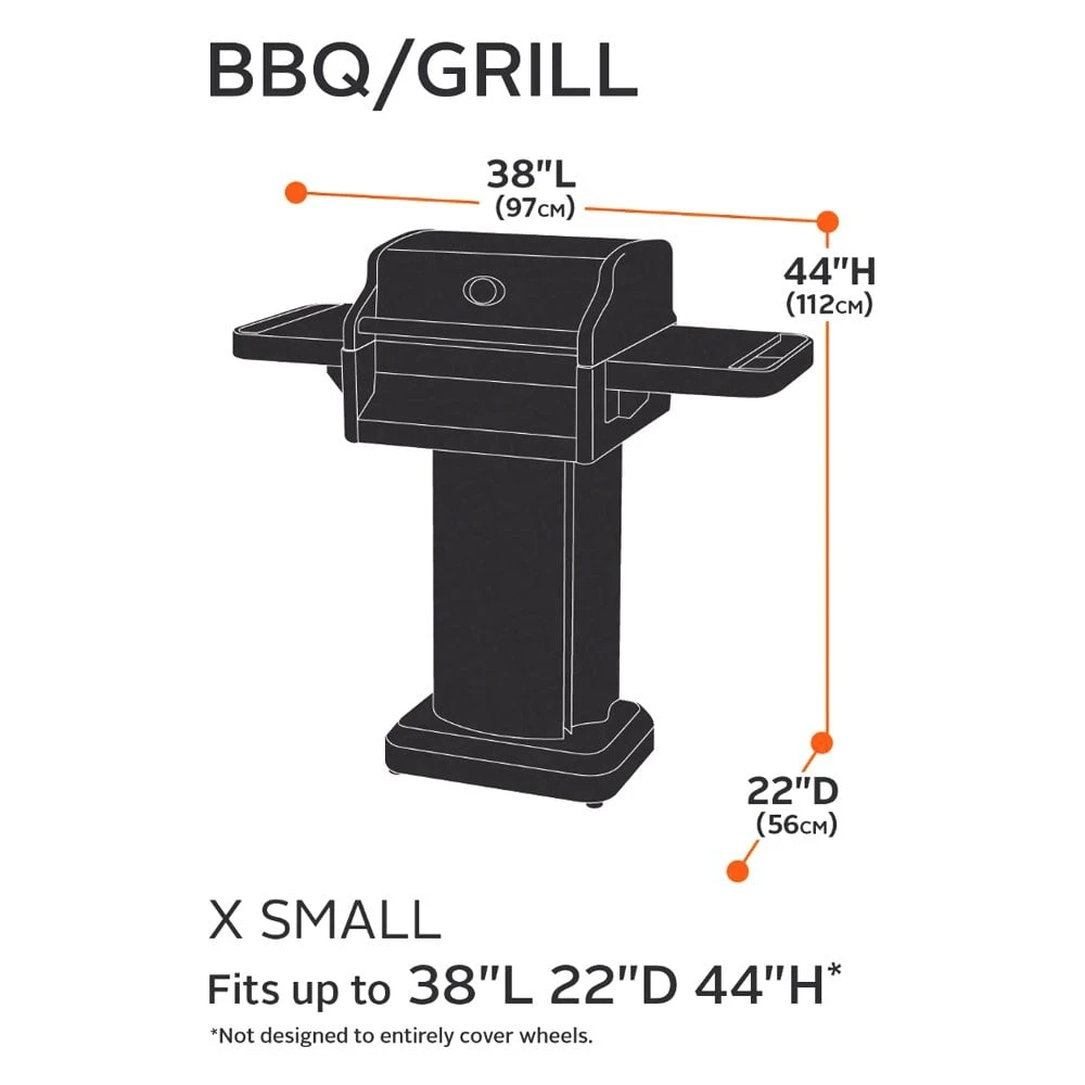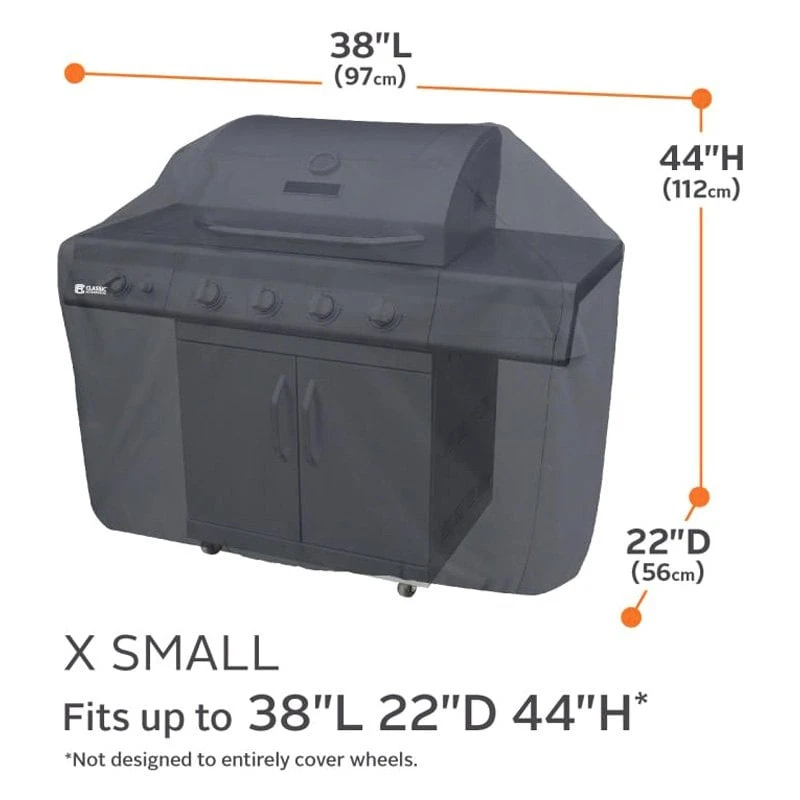 Classic™ Black X-Small BBQ Grill Cover (38″L x 22″W x 44″H) by Classic Accessories®. Tough fabric with water-resistant backing protects against rain, snow, sun, dirt and won’t crack in the cold.