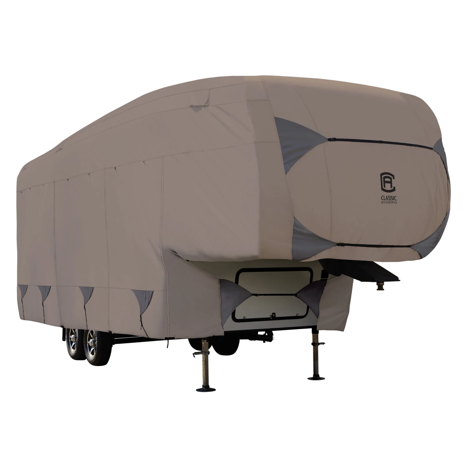 Encompass™ Cinder 5th Wheel Trailer Cover by Classic Accessories®. Keep your RV ready for any expedition with Encompass RV Covers, by Classic Accessories. Spend less time cleaning and more time enjoying your RV when you’re ready to explore the outdoors. Encompass covers use sturdy ripstop fabric to protect your RV from harsh UV rays and inclement weather conditions, helping prevent black streaks on your siding and leaves from gathering directly on your roof. Practical features come together to make a strong cover that looks great near your home. The lightweight fabric is easy to lift and carry, the undercarriage Toss Bag System means you don’t have to scramble under the RV to secure the cover, and the dusky Cinder color is a natural, neutral tone that doesn’t show dirt as easily as a lighter color.