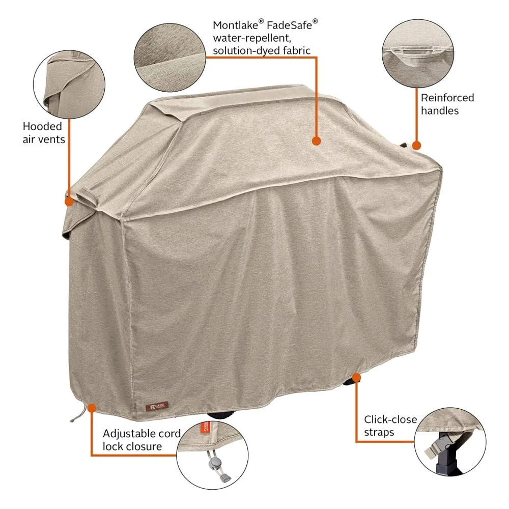 Montlake™ Heather Gray XX-Large BBQ Grill Cover (72″L x 26″W x 51″H) by Classic Accessories®. Offering elegant, understated style, these covers feature durable FadeSafe™ Fabric System so they’ll keep their looks while protecting your furniture season after season.