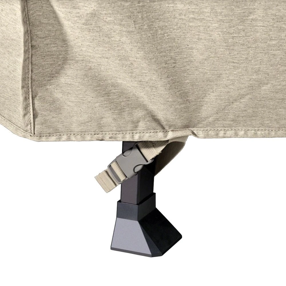 - Conveniently placed reinforced handles for easy installation and removal while click-close straps snap over legs to secure cover on windy days