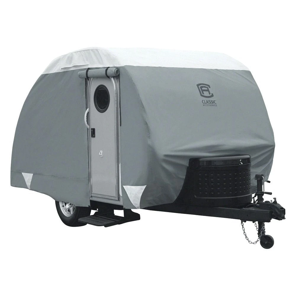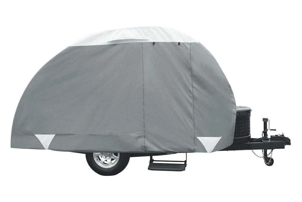 Over Drive PolyPRO3™ Deluxe Gray with White Roof Teardrop Travel Trailer Cover by Classic Accessories®. Durable PolyPRO3 RV covers provide streamlined, strong protection that stands out from the pack. Max Weather Protection with 3-Ply Poly Fabric Roof RV Cover. Durable PolyPro 3 RV covers provide all season weather protection. Heavy duty, triple ply PolyPro 3 fabric tops and quick drying PolyPro 1 sides protect while reducing bulk. Keep your trailer in mint condition with this high quality trailer cover made for you to enjoy all the comforts of home away from home. Whether you are looking for a cover for mild, moderate or severe weather conditions.