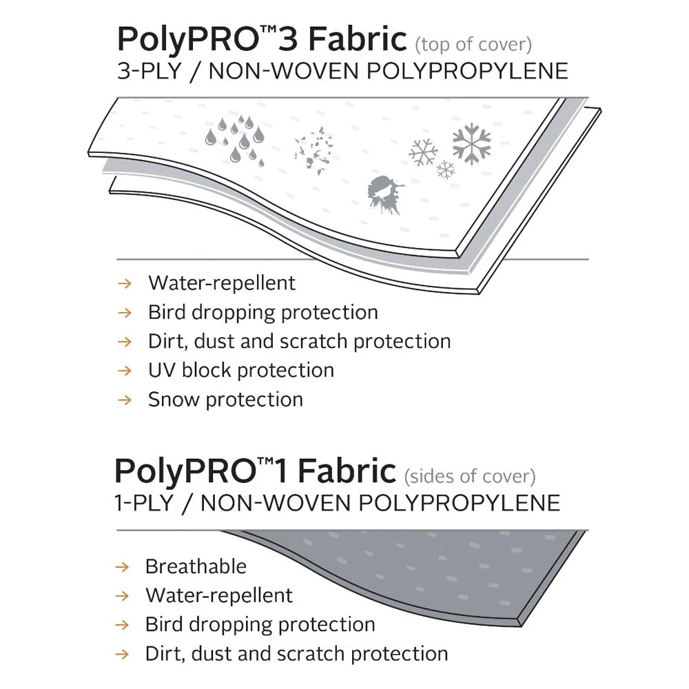 - The thick triple-ply fabric top defends your RV from rain, snow, dirt, and scratches for all-season protection