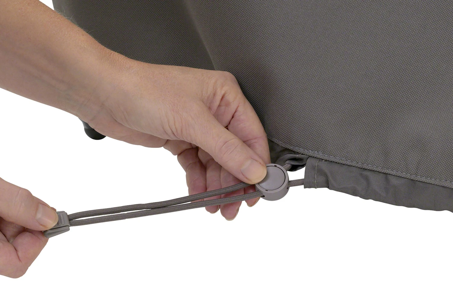 - Water-resistant backing keeps your barbecue dry while elastic hem cords move easily through a special channel for a snug fit