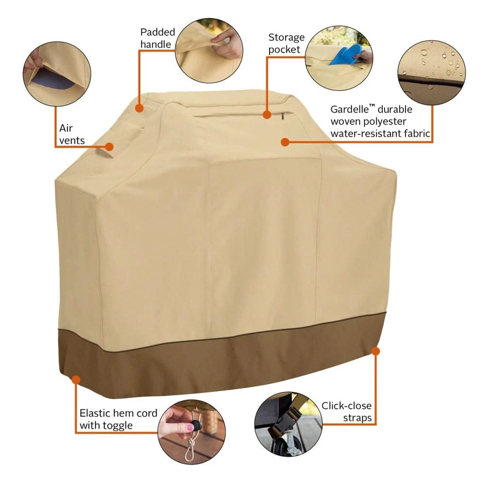 Veranda™ Pebble Small Grill Cover (44″L x 22″W x 44″H) by Classic Accessories®. A customer favorite for its fashionable design, durability and extensive collection of covers, the Veranda line features our heavyweight Gardelle™ woven polyester fabric and special water-repellent and resistant undercoating.
