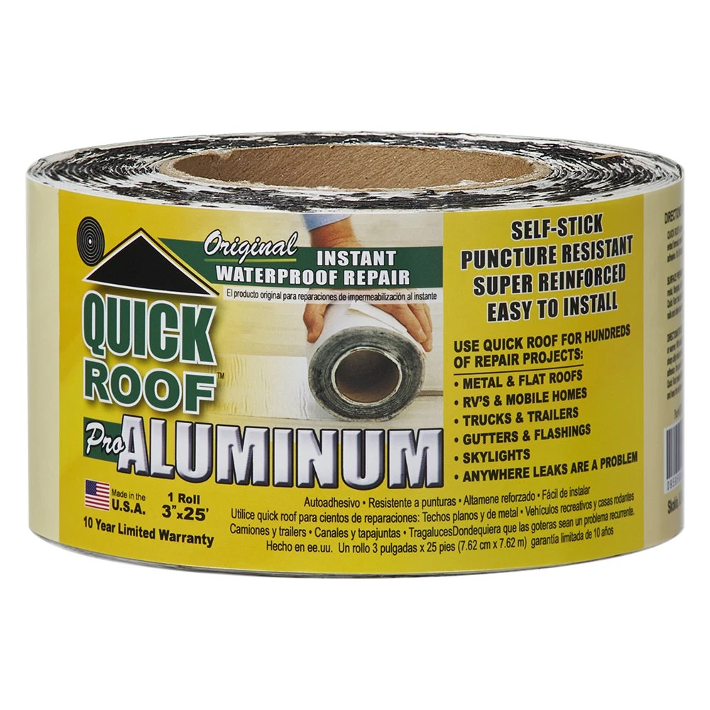 Quick Roof Pro™ Metal Gray Roll Tape (3″W x25’L) by Cofair Products®. Quick Roof is the original aluminum-faced self-adhesive roll roofing and roof repair material. Its patented formula consists of a polymer reinforced aluminum surface and an aggressive rubberized asphalt adhesive.
