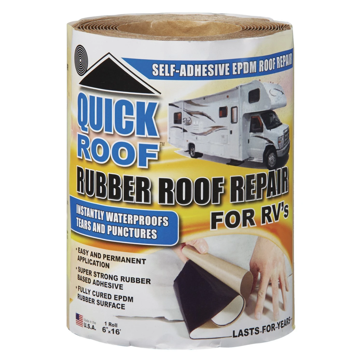Quick Roof™ EPDM Rubber Tan Roll Tape (6″ x 16″) (6″W x 16’L) (RQR616) by Cofair Products®. The CoFair Products Quick Roof Rubber Roof Repair Patch – will stop leaks in all EPDM rubber roofs, especially on your RV, trailer and camper. It makes a permanent bond using a strong rubber based adhesive and will last for many years, allowing you to not stress about it leaking again.