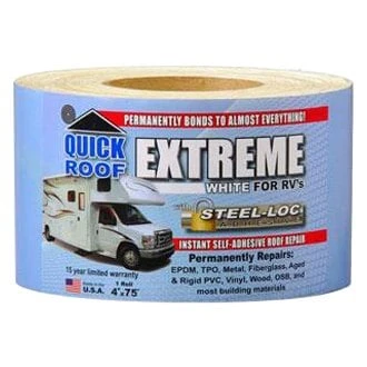 Quick Roof Extreme™ Multi-Purpose White Roll Tape (4″W x 75’L) (UBE475) by Cofair Products®. The CoFair Products Extreme Rapair Roll is perfect for having on hand when on a camping trip. If a storm blows in and you get a tear in the roof of your RV, trailer or camper, this kit could be a life saver. For this reason, it makes Quick Roof the best for use on your RV, trailer or camper.