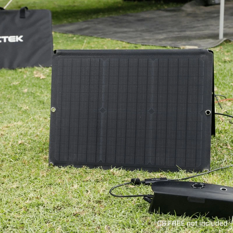 CS FREE™ 12 V Portable Solar Charging Kit for CS FREE™ Portable Battery Charger and Maintainer by CTEK®. The SOLAR PANEL CHARGE KIT pairs perfectly with the CS FREE. It delivers fast, reliable solar power so you can recharge or even independently power your CS FREE wherever you take it. Made from super tough fibreglass, you simply unfold it and connect it to your CS FREE in seconds, giving you the ultimate freedom from mains power. Charge and maintain your vehicle battery or charge up portable tech like smart phones, pads and laptops, even when you’re nowhere near a power outlet. The SOLAR PANEL CHARGE KIT features intelligent and efficient silicon cells with a specially developed safety box so the kit delivers exactly the right amount of power to protect your battery and devices from excess voltage. Waterproof, weather resistant and durable, the SOLAR PANEL CHARGE KIT is the perfect outdoors partner for the CS FREE.
