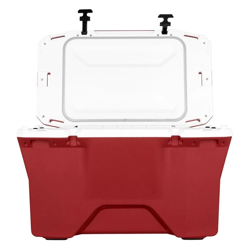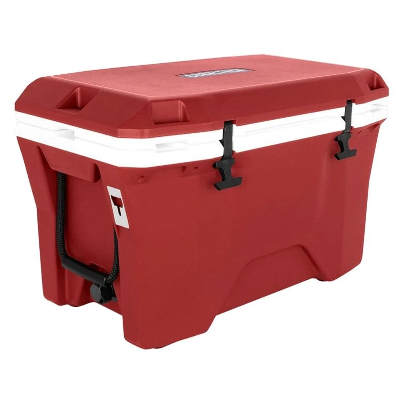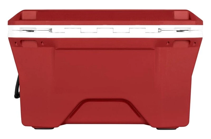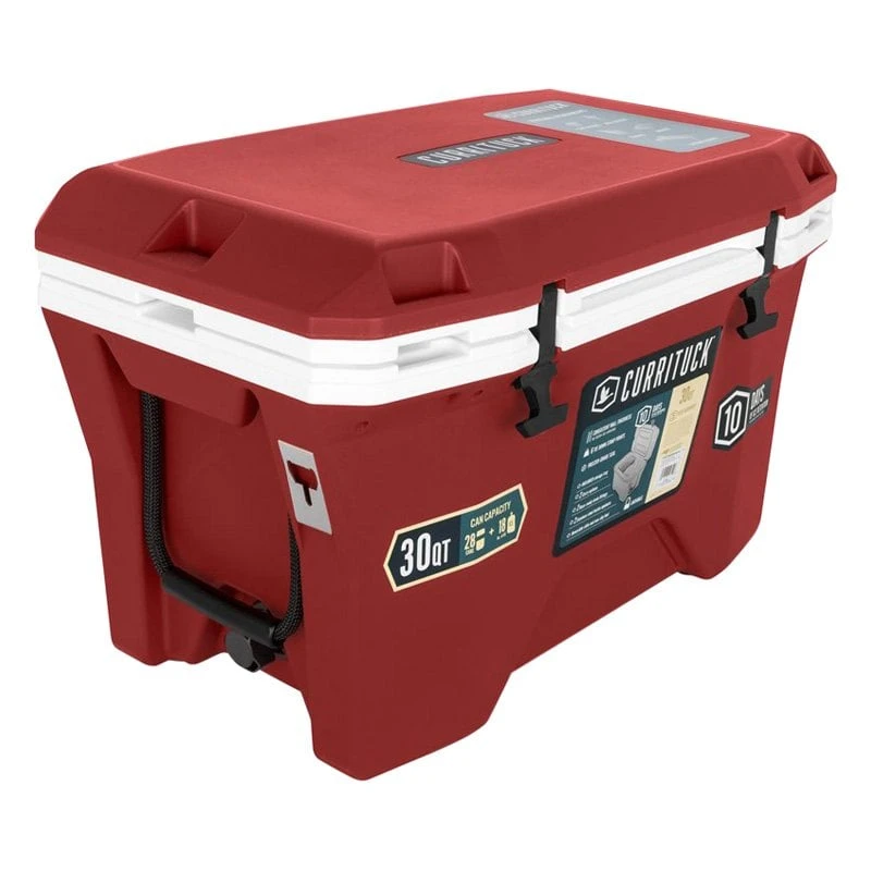 Premium 30 qt Crimson/White Hard Cooler by Currituck®. Currituck’s 30 qt Premium Cooler features an ultra-durable design with stainless steel hardware and impact modified polypropylene resin. A consistent wall thickness and freezer-grade seal help allow up to 10 days of ice retention.