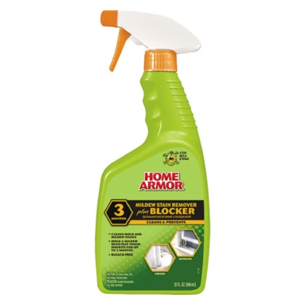 Home Armor™ 32 oz. Mildew Stain Remover Plus Blocker by Damprid®. It’s safe, powerful bleach-free formula eliminates mold and mildew stains, soap scum and mineral deposits like calcium and lime. As it cleans, it leaves behind an invisible shield that works continuously for up to 3 months to protect surfaces and materials from odor or stains caused by moisture. It’s effectiveness is not diminished by washings or rain.