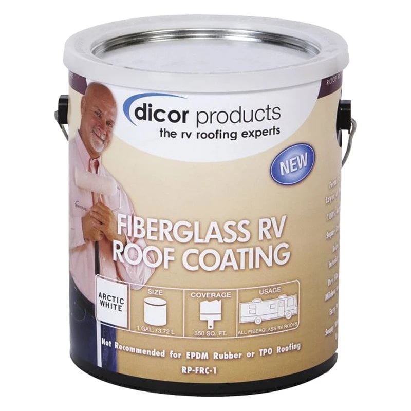 128 oz. Acrylic Fiberglass Roof Coating by Dicor®. Dicor Fiberglass RV Roof Coating protects and beautifies fiberglass and previously coated RV roofs. This product is made of high-quality materials to serve you for years to come. Designed using state-of-the-art technology and with customers in mind. It will meet your needs and deliver great quality at an affordable cost.