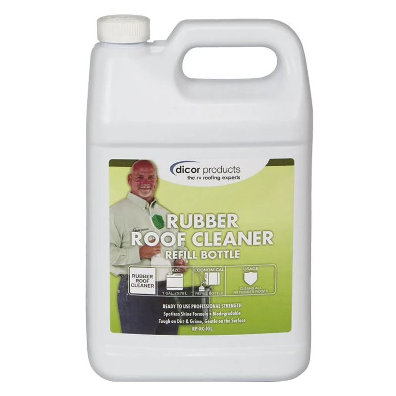 128 oz. Rubber Roof Cleaner (RPRC1GL) by Dicor®. Formulated specifically for RV EPDM rubber roofing, TPO, vinyl, fiberglass and exteriors. Dicor Rubber Roof Cleaner lifts dirt and grime yet is gentle on the surface. Its water-softening agents combat hard water spotting. Simply spray on, brush with a soft bristle brush and rinse off – leaving a brilliant, spotless surface.