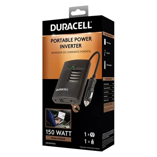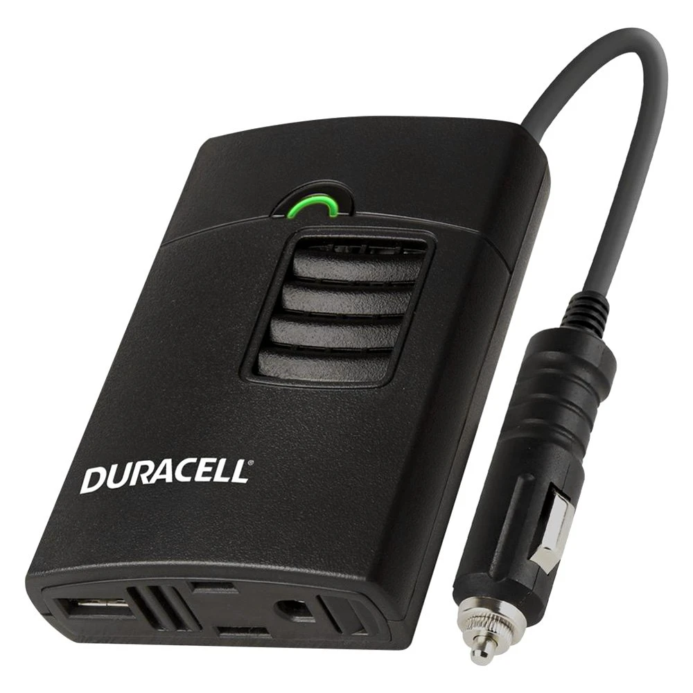150W 12 DC 115 AC Portable Power Inverter by Duracell®. The Duracell Portable Power Inverter converts vehicle power into household current, letting you run and recharge your favorite devices (up to 150 Watts) inside your car. Its sleek form factor features one 3-prong AC outlet and one 2.1 Amp USB port and the unit can charge AC and USB devices simultaneously. A 3′ cord plugs directly into your car’s DC port, allowing you to place this anywhere that’s convenient while in use. It is ideal for travel and mobile offices, and its elegant design complements any car interior.