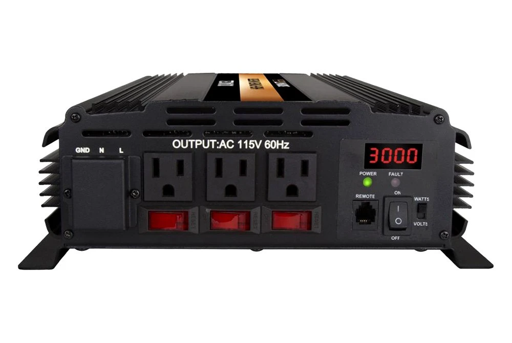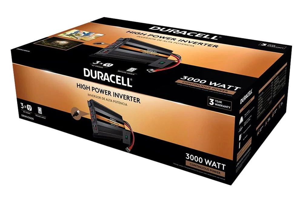 3000W 12 DC 115 AC Modified Sine Wave Power Inverter by Duracell®. Ideal for outdoor recreation, mobile entertainment and job sites, the Duracell 3000 Watt Inverter supplies up to 3000 Watts of continuous power and 6000 Watts of peak power using your car’s battery current. This rugged inverter converts vehicle power into usable household AC power. Three 3-prong AC outlets charge and operate up to three devices at once, powerful enough for entertainment equipment, handheld tools, large appliances and electronics.