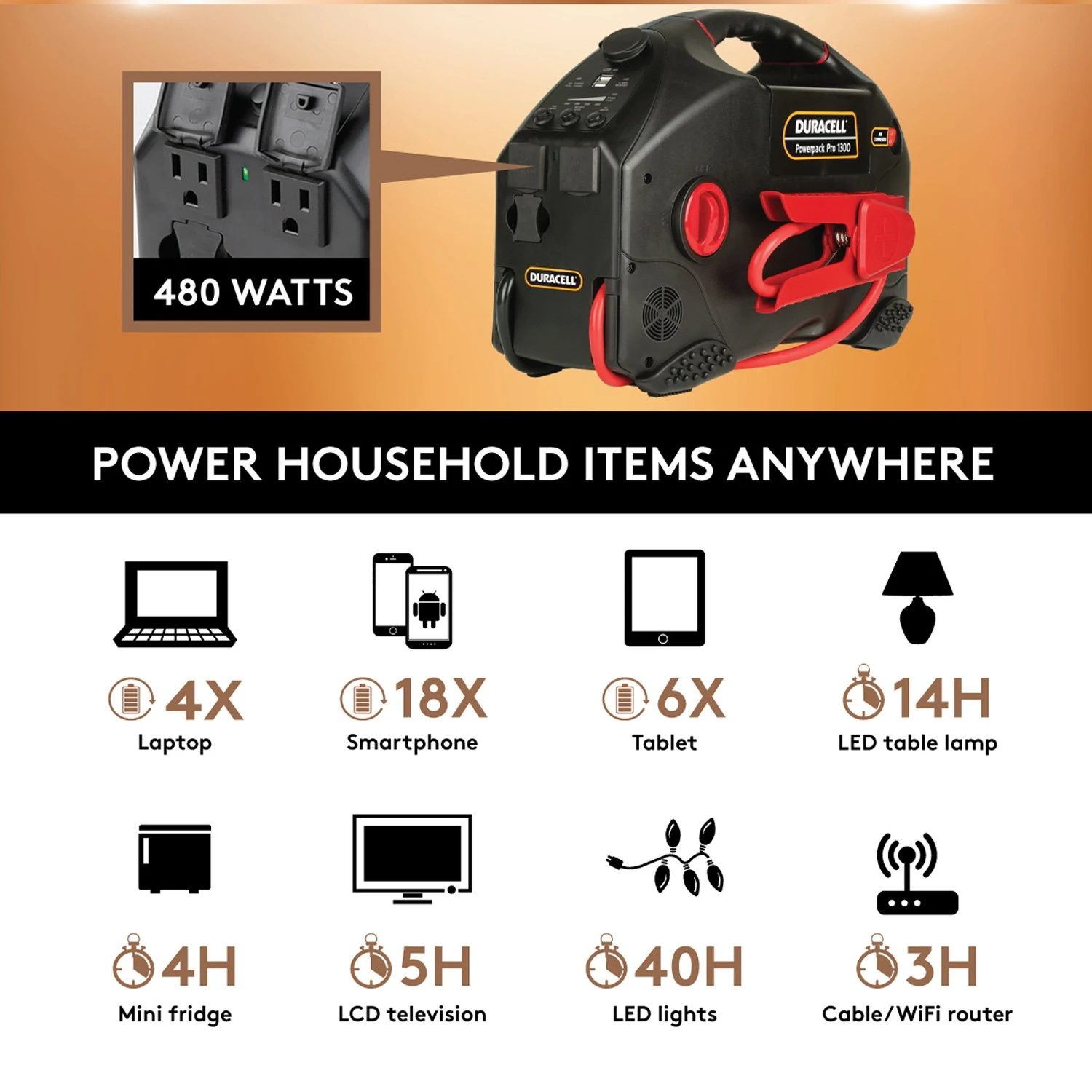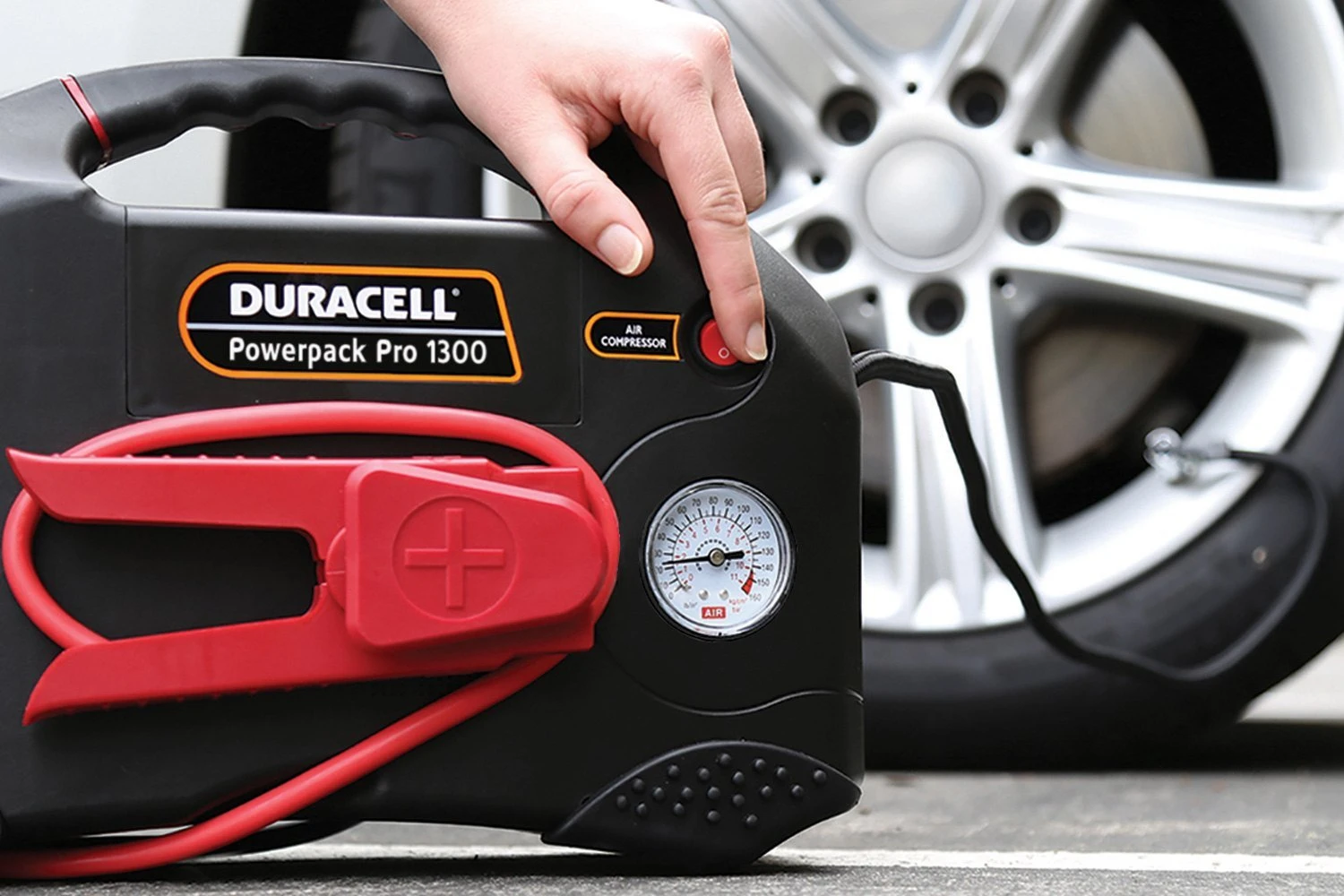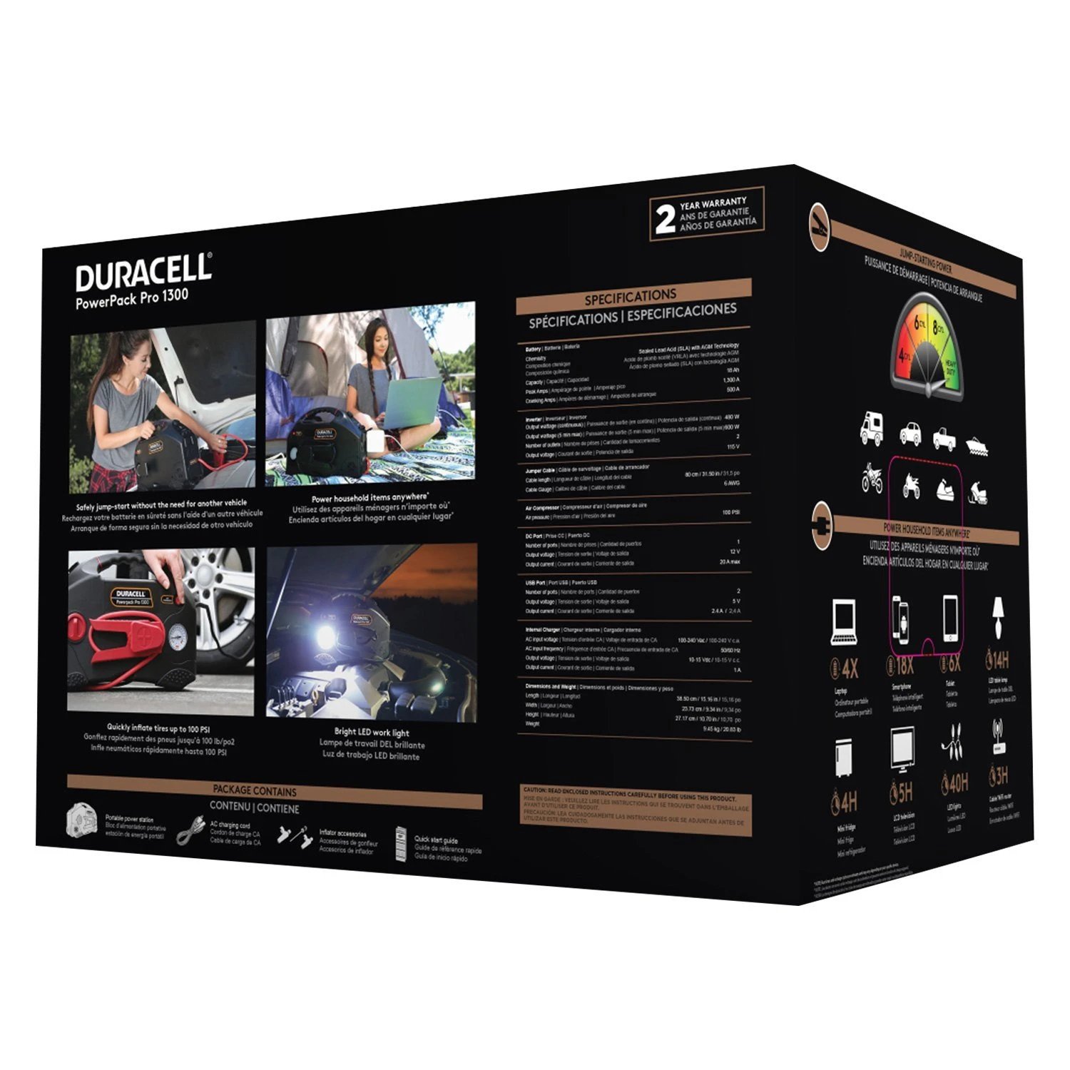 Powerpack Pro™ 12 V Portable Jump Starter with Air Compressor and Power Inverter (DR1300PWR) by Duracell®. A workhorse for both recreation and roadside emergencies: The Powerpack Pro 1300 recharges engines up to 8 cylinders with 1300 peak A of starting current. Its 18Ah rechargeable battery serves as a stand-alone power source, getting you back on the road without the need for another car. The Powerpack also operates a variety of tools and electronics (up to 600 combined Watts) through its dual AC outlets and two 2.4A USB ports. An integrated air compressor also supplies up to 160 PSI to inflate tires and sports equipment. The Powerpack 1300 is designed for heavy use with a tough outer case, 6 AWG jumper cables, 12V DC auxiliary power port, and a bright LED flashlight.