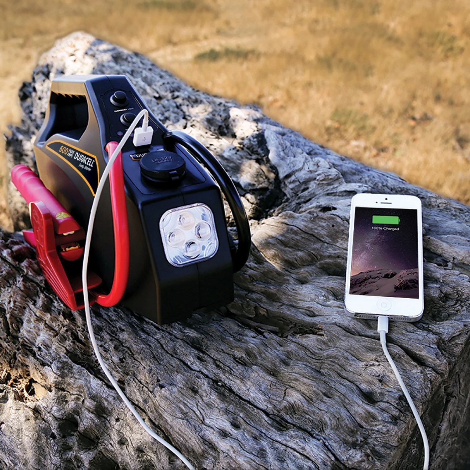 12 V Portable Emergency Jump Starter and DC Power Ports (DRJS20) by Duracell®. Never be caught with a dead battery! Stand-alone jump-starter restarts engines up to 8 cylinders with no “host” vehicle needed. Its internal rechargeable 9Ah battery delivers up to 750 peak A of power. Charge smartphones, tablets and more with a built-in 2.1 Amp USB port, keeping your critical communications up and running. The Jump-Starter also features a tough weather-resistant housing with 12V auxiliary DC port, copper-clad 8 AWG jumper cables, LED battery fuel gauge, and a bright LED work light.