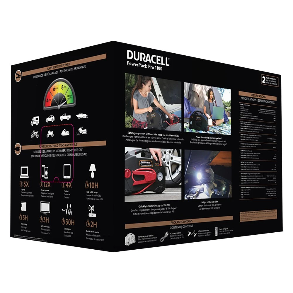 Powerpack Pro™ 12 V Portable Jump Starter with Air Compressor and Power Inverter by Duracell®. Imagine a situation when your battery is dead and you are stuck somewhere on the road. A high-performance engine starter is an essential tool to have at hand in emergency situations, while an efficient battery charger will help you fix the problem of a flat battery in a few hours when there is no rush. Get these premium tools and feel confident to start your vehicle, whatever the situation is.