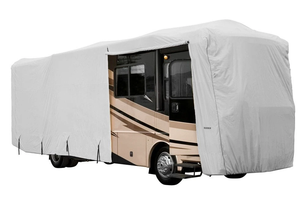Goldline™ Gray Class A Motorhome Cover (Gray, Up to 34′) (GLRVA3234G) by Eevelle®. Expedition Series RV covers are designed for durability to protect your investment from the harshest weather conditions. Every one of covers is crafted and manufactured to perform season after season for many years to come. Innovative features and fabrics make it truly the best value in protective coverings for your RV.
