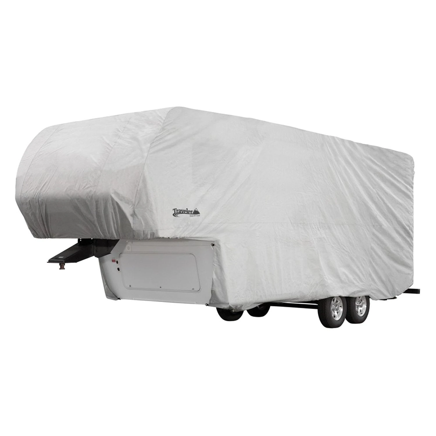 Traveler™ Gray 5th Wheel Trailer Cover (Gray, Up to 37′) (TSFW3337) by Eevelle®. Designed to be rugged, durable and economical, yet provide the same quality of protection that you would expect from a much more expensive cover. Protect your investment season after season with the best 100% Polypropylene cover on the market.