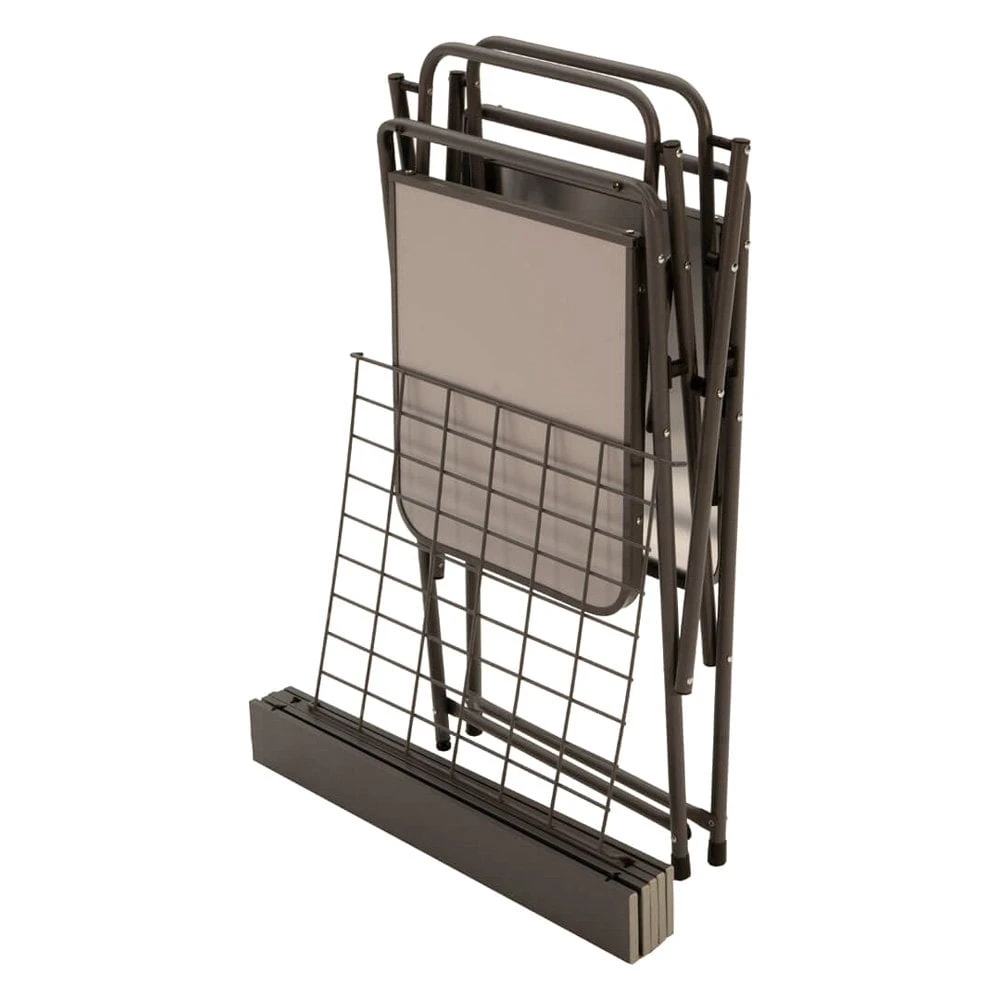 - Place your camp stove on the main platform and foods and accessories on the two side platforms