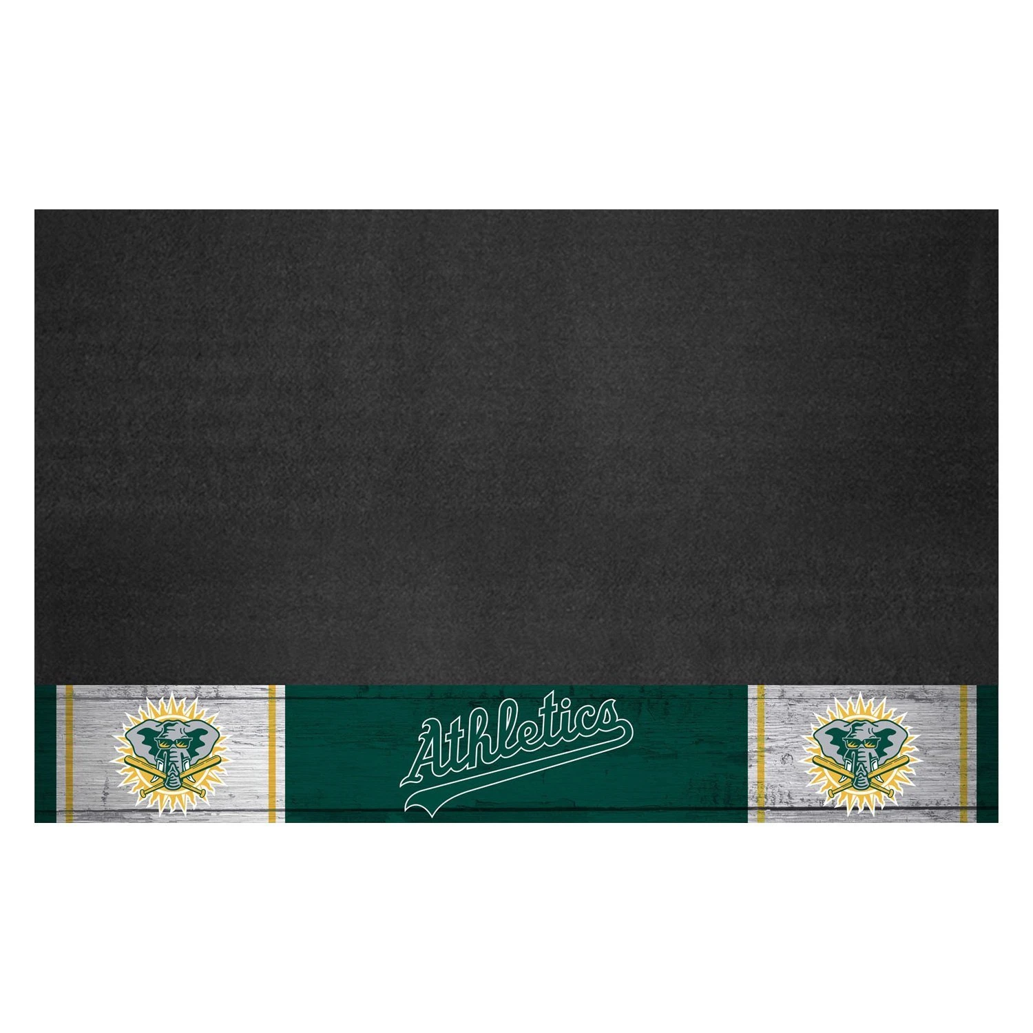 MLB “2000 Oakland Athletics” 26″ x 42″ Retro Grill Mat (2319) by FanMats®. Then Grill Mats by Sports Licensing Solutions were made for you. Both practical and decorative, they protect your deck or patio while displaying your favorite MLB Retro Logo! These 100% vinyl Grill Mats fit under most grills, prevents spills from soaking in and staining, and cleans up easily with a garden hose. Keep the mat clean by spraying with water and wiping with a soapy cloth. Not to be used on composite decking material. Made in the USA.