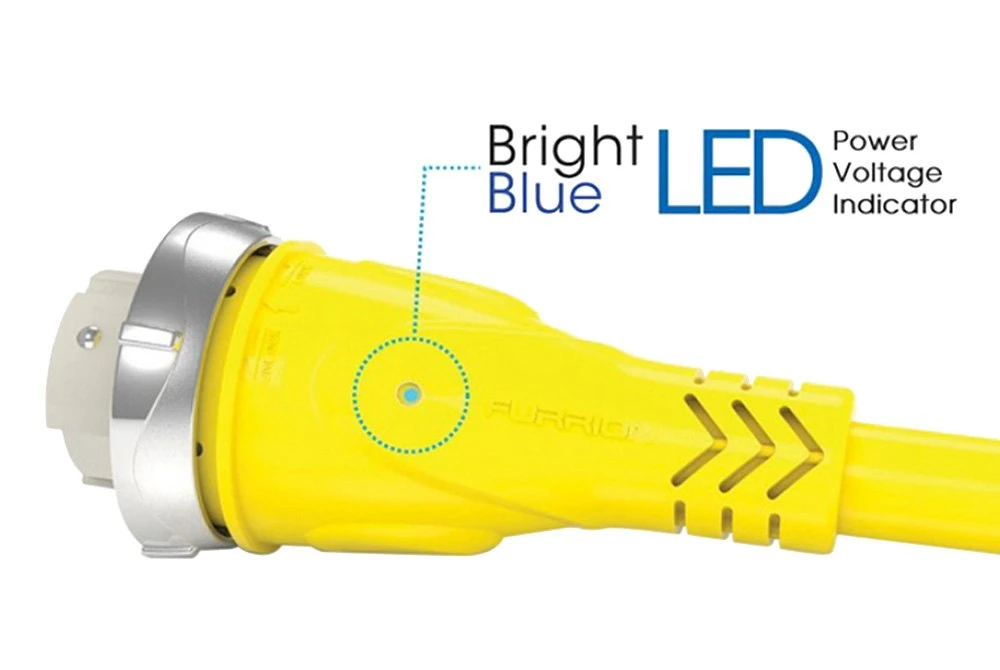 50 A 125/250 V Female to 50 A 125 V Male Yellow Pigtail Adapter with LED Indicator by Furrion®. Marine pigtail adapters are used to convert plug sizes. Furrion pigtail adapters are made to stringent quality standards, constructed with high-grade, corrosion resistant materials for longevity in the harsh marine environment. Designed for safety, Powersmart™ or Faultsmart™ indicators provide valuable, real-time information. Plug-ends feature ergonomic side grips for easy, user-friendly connection. Furrion adapters meet global industry standards, NEMA universal fit with other brands and a bonus sealing collar is included with all pigtail adapters except for FP1530SY. Furrion stands behind its shore-power products with a 5-year warranty.