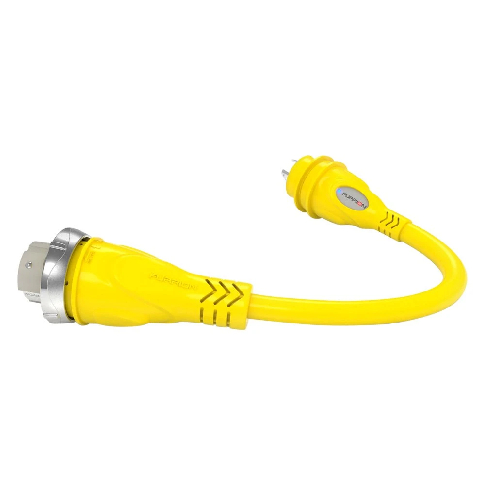 50 A 125/250 V Female to 30 A 125 V Male Yellow Pigtail Adapter with LED Indicator by Furrion®. Marine pigtail adapters are used to convert plug sizes. Furrion pigtail adapters are made to stringent quality standards, constructed with high-grade, corrosion resistant materials for longevity in the harsh marine environment. Designed for safety, Powersmart™ or Faultsmart™ indicators provide valuable, real-time information. Plug-ends feature ergonomic side grips for easy, user-friendly connection. Furrion adapters meet global industry standards, NEMA universal fit with other brands and a bonus sealing collar is included with all pigtail adapters except for FP1530SY. Furrion stands behind its shore-power products with a 5-year warranty.