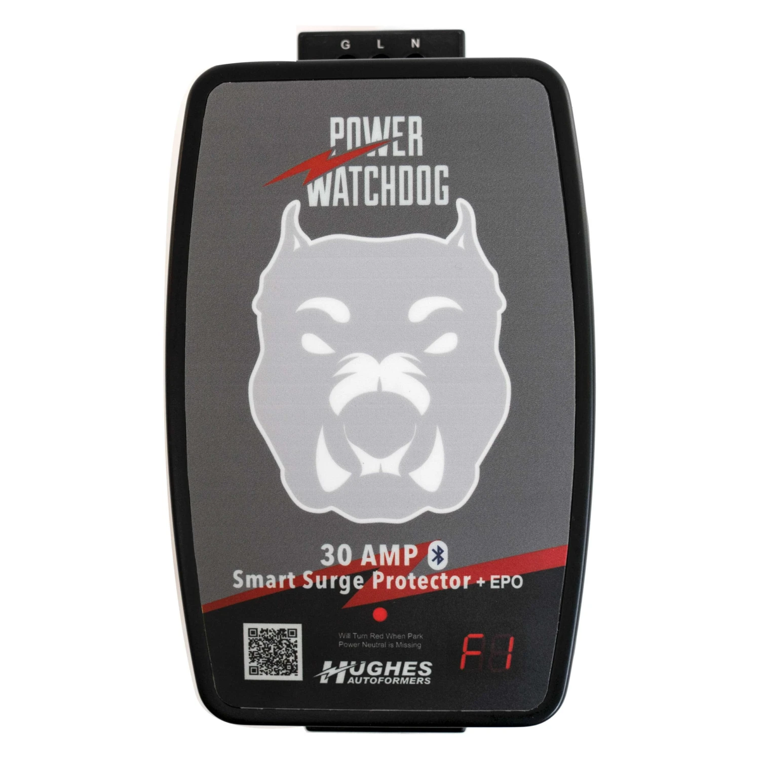 Power Watchdog™ 30A Straight Male x 30A Straight Female 30A Bluetooth Hardwire Surge Protector with Auto Shutoff by Hughes Autoformers®. 30 amp Power Watchdog Smart Surge Protector + EPO (emergency power off) offers a powerful 2,400 Joules of advanced surge protection for your coach. Our Patented Power Watchdog + EPO is the world’s 1st smart surge guard and surge protector with built-in Bluetooth connectivity so you can monitor live park power conditions on your smartphone in real time! Get text alerts of dangers before something catastrophic happens. The new EPO (emergency power off) units will automatically SHUT DOWN power if there are dangerous conditions of too high or low voltage, open ground or open neutral as well as more.