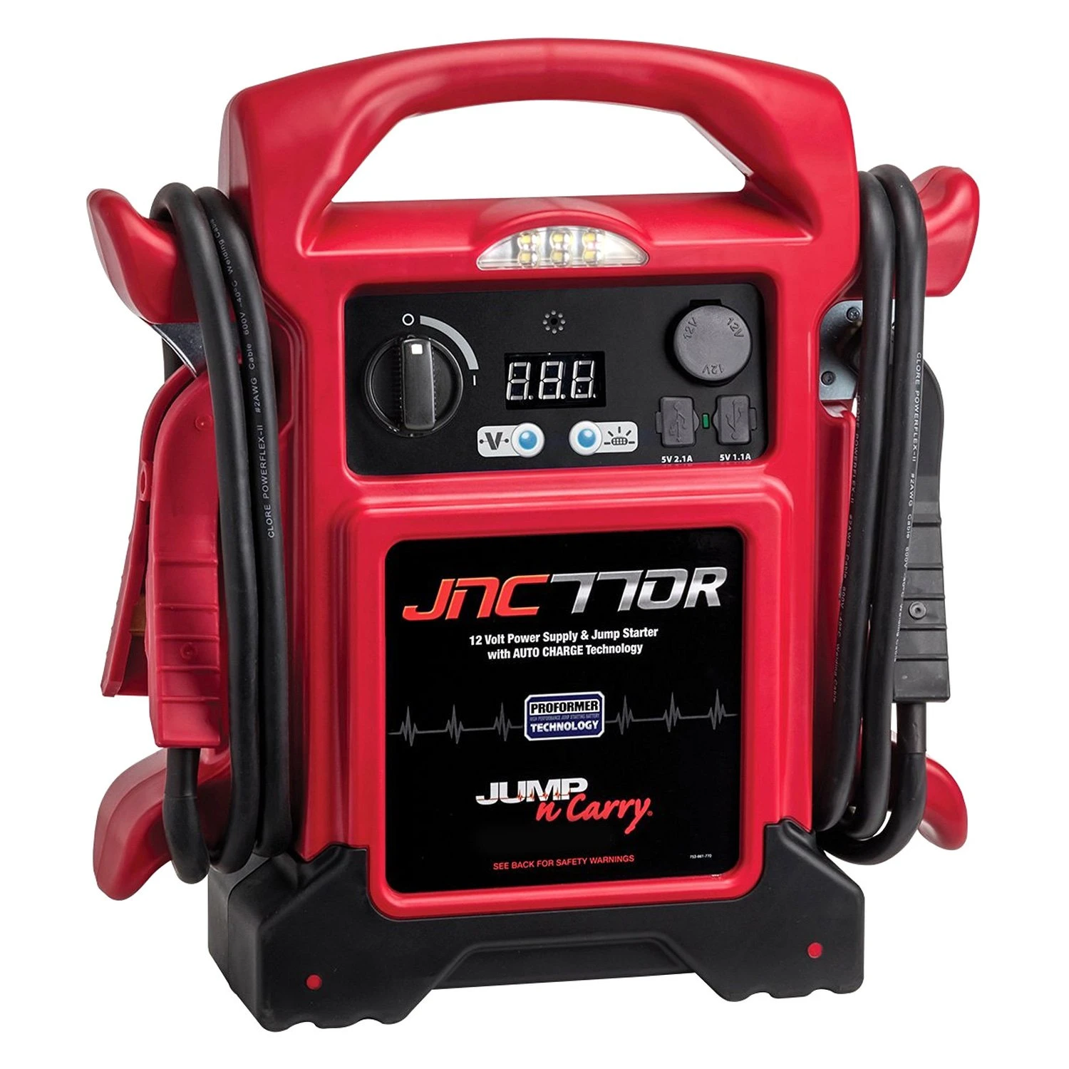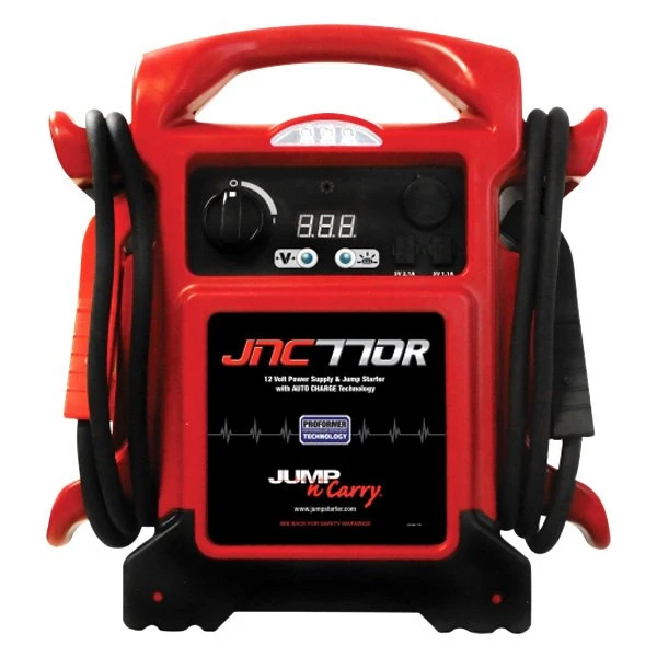 Premium™ 12 V Portable Battery Jump Starter by Jump N Carry®. Power. It’s the calling card of a Jump-N-Carry. Absolutely reliable, get-it-done without question power. The new JNC770R is no exception. Its Clore PROFORMER battery is specifically developed to perform the jump starting application and is designed to deliver exceptional cranking power, extended cranking duration, numerous jumps per charge and long service life. Plus, the JNC770R includes numerous features to make jump starting more effective and convenient. Its 68″ cable reach enables it to reach the starting points on vehicles of all shapes and sizes. Its new PowerJaw clamps deliver maximum power transfer (rated to 1000 A) and durability, thanks to their alloy core and dual molded design. A master ON/OFF switch ensures that the clamps are inactive during transportation and storage. A 3A built-in, automatic charging system makes recharging the unit fast and hassle-free. Dual USB outlets and a high intensity LED task light provide added functionality. A Repair Service Coupon enables the end user to seek a low cost, fixed fee repair after the warranty period.