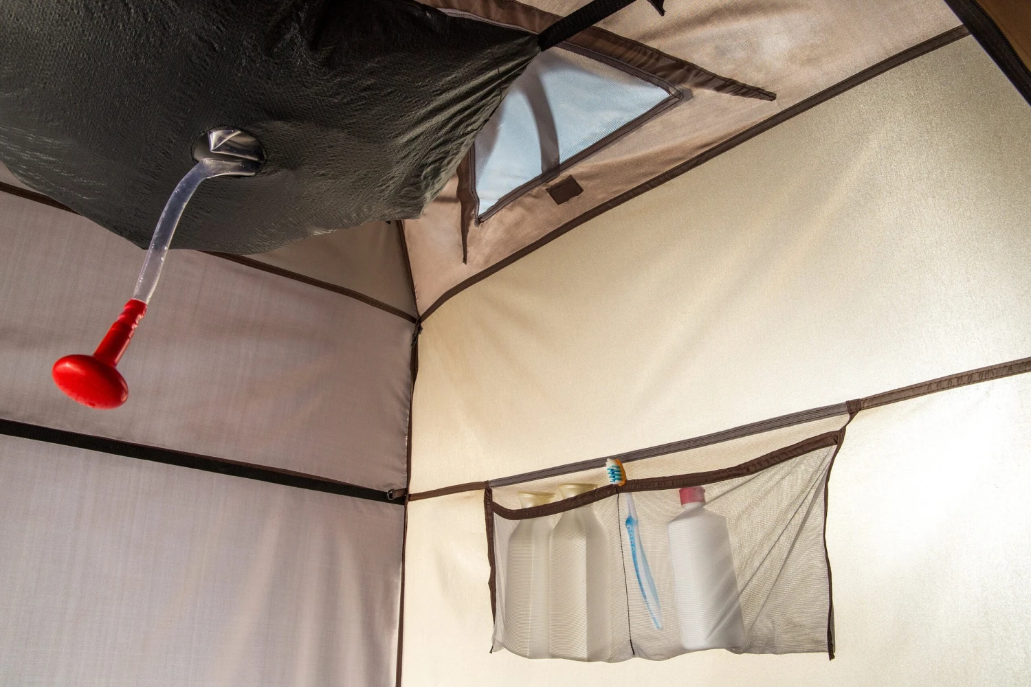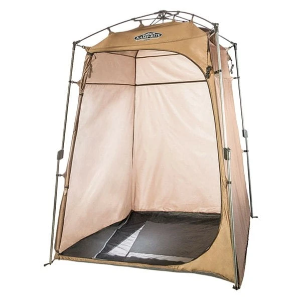 60″ L x 60″ W x 80″ H Privacy Shelter with Shower by Kamp-Rite®. Offers a fully enclosed space for changing, showering or other personal needs. Quick and easy to setup, the Privacy Shelter includes a 5 gal portable shower unit that attaches to the shelter’s strong and rigid steel frame.