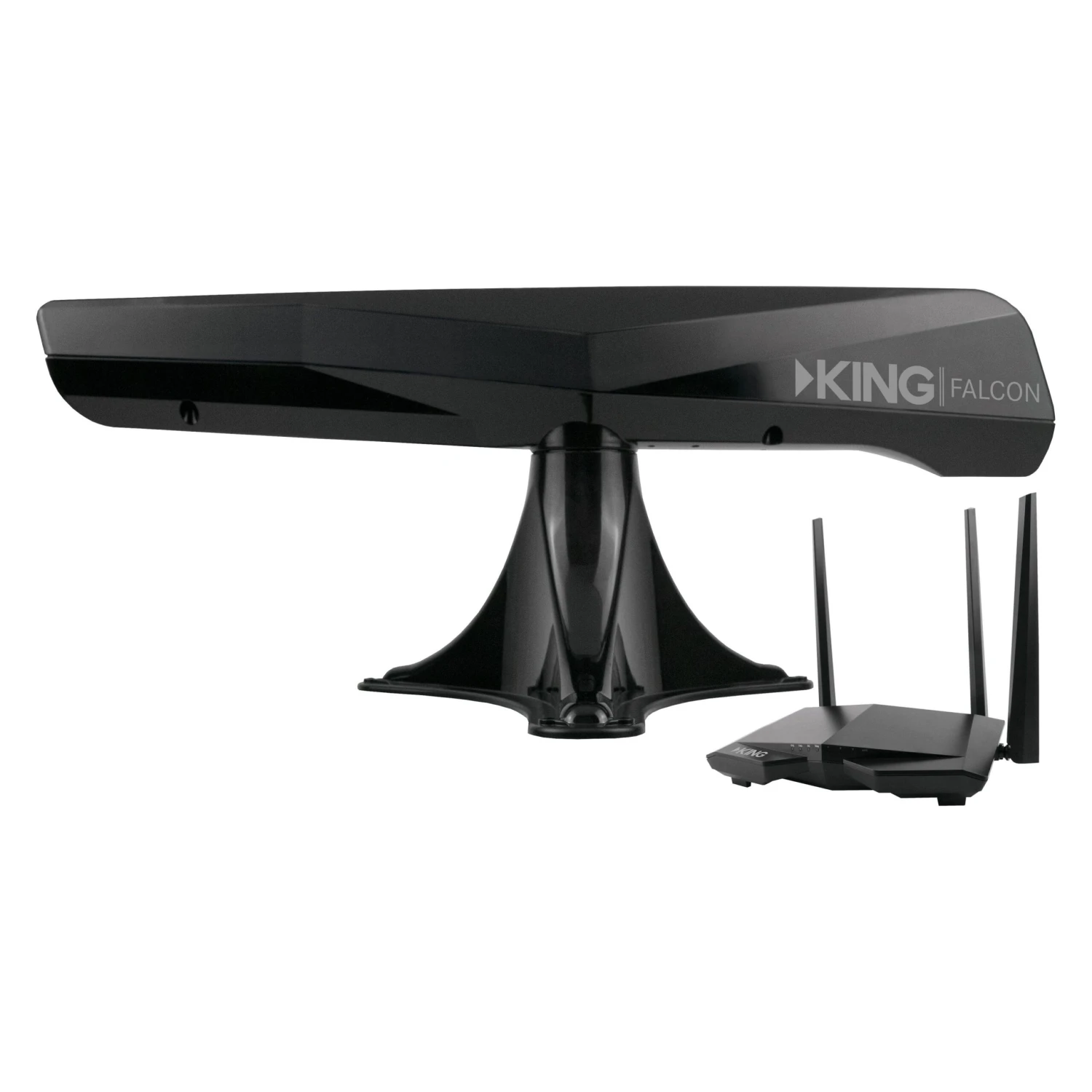 Falcon™ WiFi Antenna and WiFi Booster by King®. Stay connected anywhere you go with this essential package for tech-savvy travelers. Providing a gateway between all your web-enabled devices and the local Wi-Fi source. The KING Falcon™, stationary automatic directional Wi-Fi antenna plus the KING WiFiMax™ Wi-Fi Router/Range Extender delivers a faster, more powerful internet connection wherever you are. No more walking to the coffee shop or visitor center to get Wi-Fi. Now, you can connect right from your vehicle. No monthly service fee and no contract. The Falcon takes advantage of the increased power and performance of a directional Wi-Fi antenna, without the traditional hassle of aiming the antenna. The KING Falcon mounts to your vehicle’s roof, so you can maximize the range and performance of the KING WiFiMax, making this the ideal combination for RVers, truckers, campers, tailgaters, and all mobile adventurers who want to remain connected to the internet.
