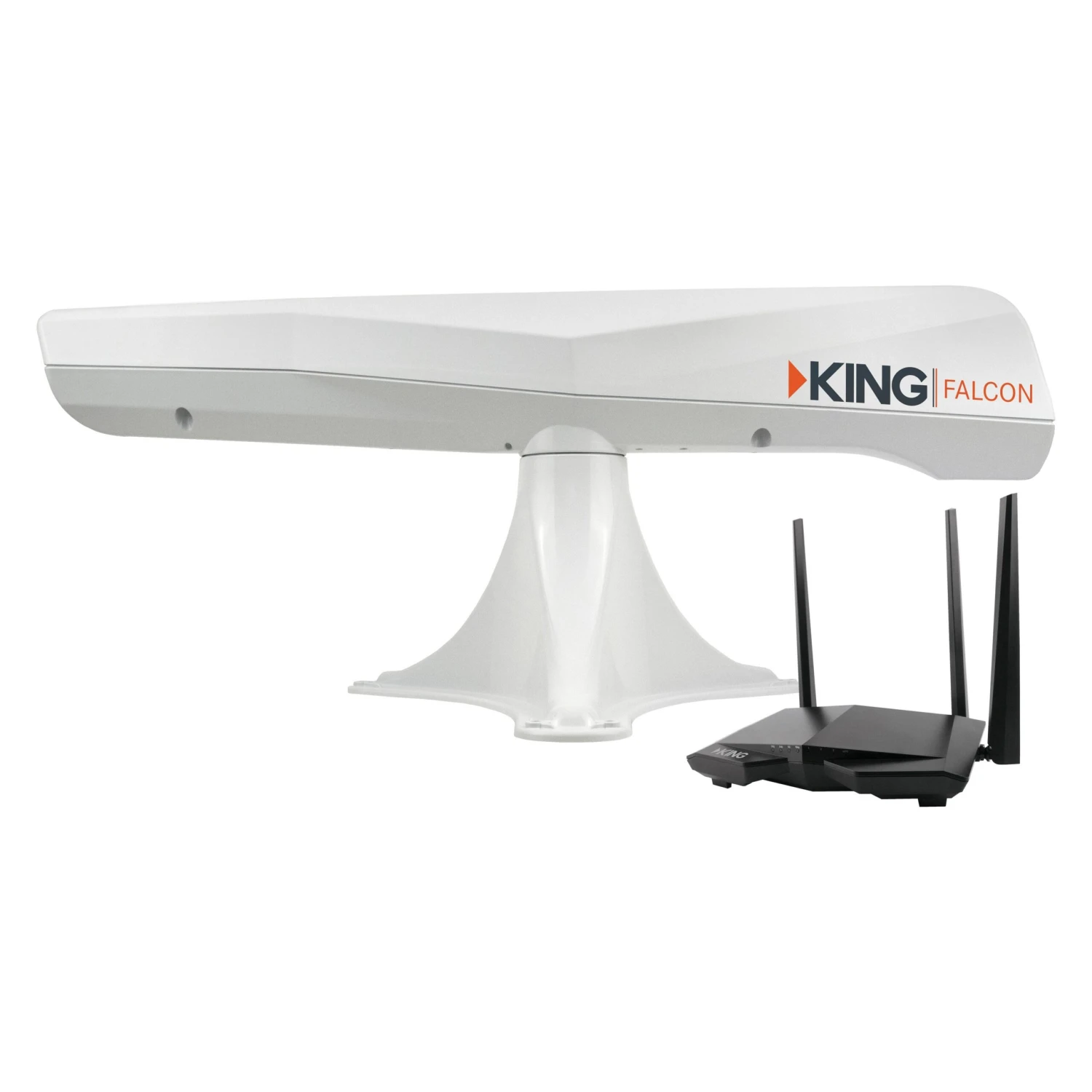 Falcon™ White WiFi Antenna and WiFi Booster (KF1000) by King®. Stay connected anywhere you go with this essential package for tech-savvy travelers. Providing a gateway between all your web-enabled devices and the local Wi-Fi source. The KING Falcon™, stationary automatic directional Wi-Fi antenna plus the KING WiFiMax™ Wi-Fi Router/Range Extender delivers a faster, more powerful internet connection wherever you are. No more walking to the coffee shop or visitor center to get Wi-Fi. Now, you can connect right from your vehicle. No monthly service fee and no contract. The Falcon takes advantage of the increased power and performance of a directional Wi-Fi antenna, without the traditional hassle of aiming the antenna. The KING Falcon mounts to your vehicle’s roof, so you can maximize the range and performance of the KING WiFiMax, making this the ideal combination for RVers, truckers, campers, tailgaters, and all mobile adventurers who want to remain connected to the internet.