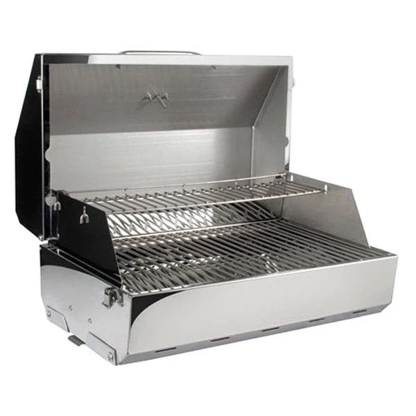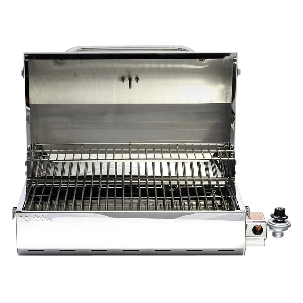 Elite 316 Gas Grill by Kuuma®. The Kuuma Elite 316 Grill is an outstanding grill with all of Kuuma’s premium features, ideal for the grilling enthusiast. The Elite 316 offers full-size grilling power and features all in a convenient, compact size. It is constructed of high-quality stainless steel and comes fully assembled. The Elite 316 Grill features a simple control knob for precise heat control, push-button igniter and built-in thermometer. Integrated fold-away legs enable easy grilling on any flat surface. It also features a removable warming rack, removable Lift-and-Clean™ liner, grease tray, latching lid and stay-cool handle. Designed for high pressure, disposable 1 lb propane canisters or larger refillable tanks with hose attachment. Canisters, tanks and hoses sold separately.