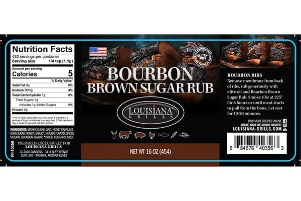 16.0 oz. 16 oz. Bourbon Brown Sugar Rub by Louisiana Grills®. A distinct blend of brown sugar, honey and bourbon that will bring mouthwatering flavor to your grill. Try the Louisiana Grills® Bourbon Brown Sugar Rub on ribs, chops or whole BBQ chicken for an unforgettable experience.