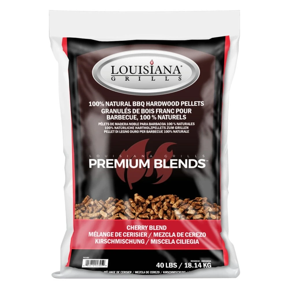 Premium Blends™ Cherry Blend Hardwood Pellets by Louisiana Grills®. The mild aroma imparts a tart and fruity flavor that is complementary to any dish, while the subtle sweetness works well with beef, pork, poultry, and fish.