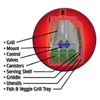 - Grill, fuel canisters, control valves, rectangular fish & veggie tray, serving shelf & griddle Not included