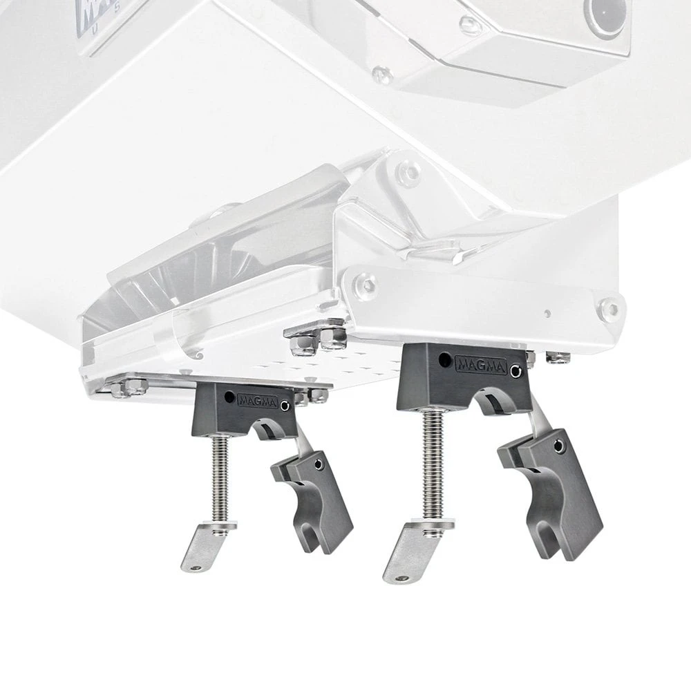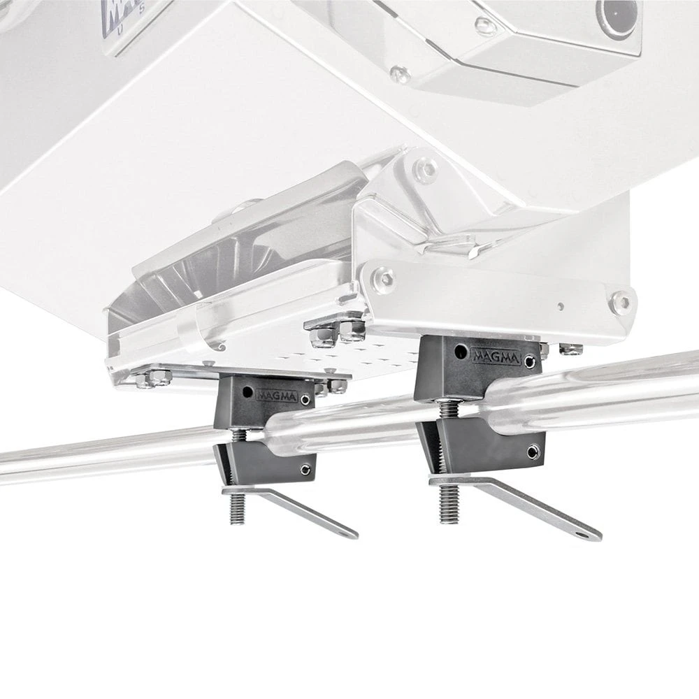 “Dual” Horizontal Round Large Rail Mount by Magma®. Incredibly strong and rigid, these rail mounts will not slip on the rail. They have a unique pivoting design which allows them to attach to curved rails or across the corner of a stern rail. Made of 18-8 stainless steel and 356 hard anodized aluminum, they instantly detach without tools for compact storage leaving no hardware on the rail